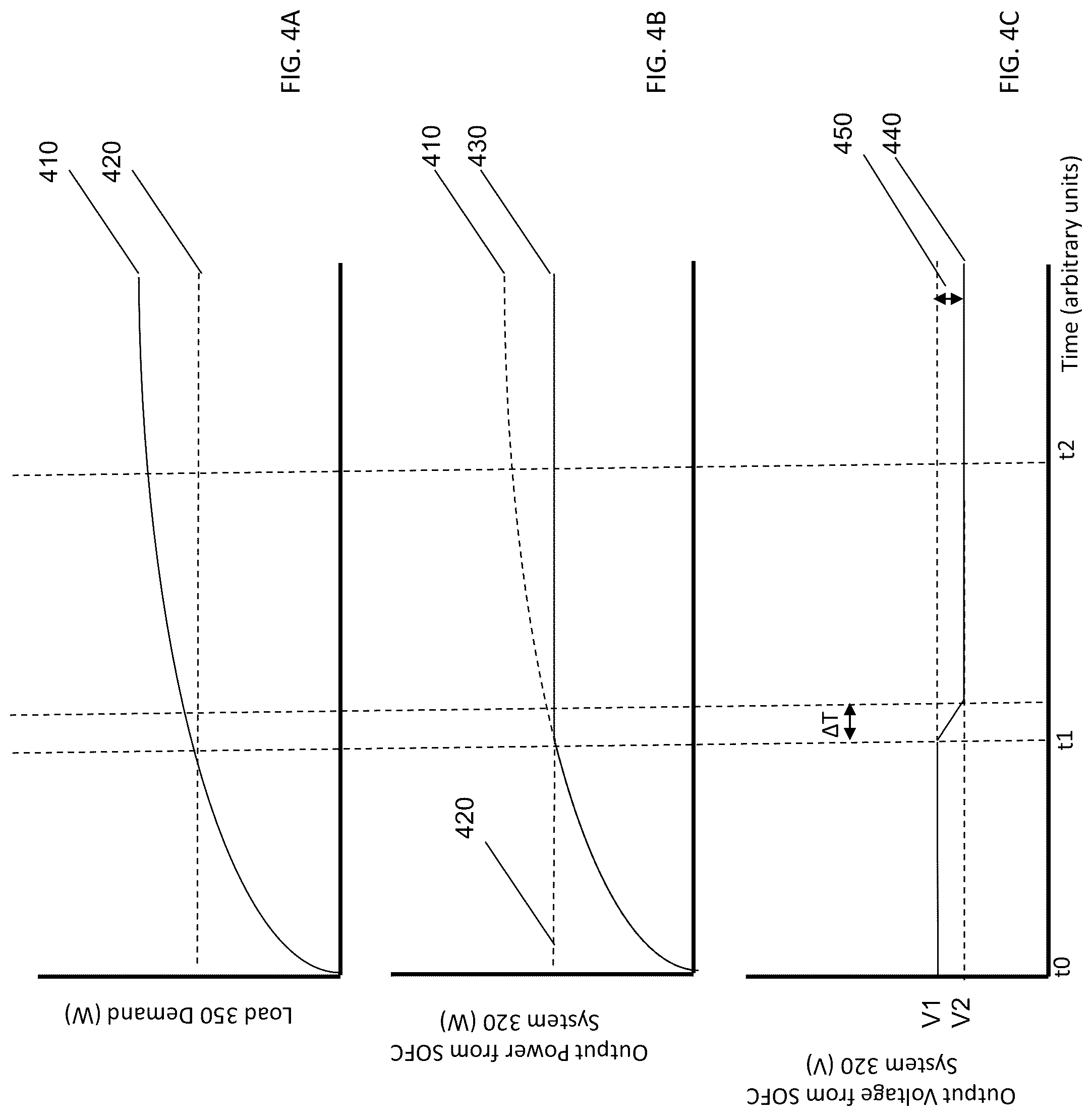 [0051]As shown in FIG. 4C, droop 450 is generally the difference between a steady state voltage V1 output by SOFC system 320 from time t0 to time t1 and a lower voltage V2 applied from t1 onward. Droop 450 may be fixed percentage of V1, for example less than 5% of V1, such as 0.5% to 4%, or 1% to 3% of V1. Generally, it can be advantageous for droop 450 to represent a large enough change in output voltage 440 to be detected by controller 340d. At the same time, it may be advantageous for droop 450 to be small enough in magnitude to be acceptable by the load 350 operating specification and to result in relatively insubstantial change to the output power 430 of SOFC system 320 such that the operation of other components (e.g., UPS 340 or devices in load 350) are not substantially affected by the change in output voltage. In some embodiments it may be advantageous for droop 450 to be substantially less than 5% of V1 (e.g., 3% or less). Droop 450 can be chosen to best fit the particular application and the sensitivity of the various components involved (e.g., UPS 340 controller 340d). Droop 450 can alternatively be chosen for more general applications allowing increased flexibility to use SOFC system 320 with a variety of different components, such as UPS 340, with different specifications and made by different manufacturers without the express aim of being compatible with SOFC system 320.