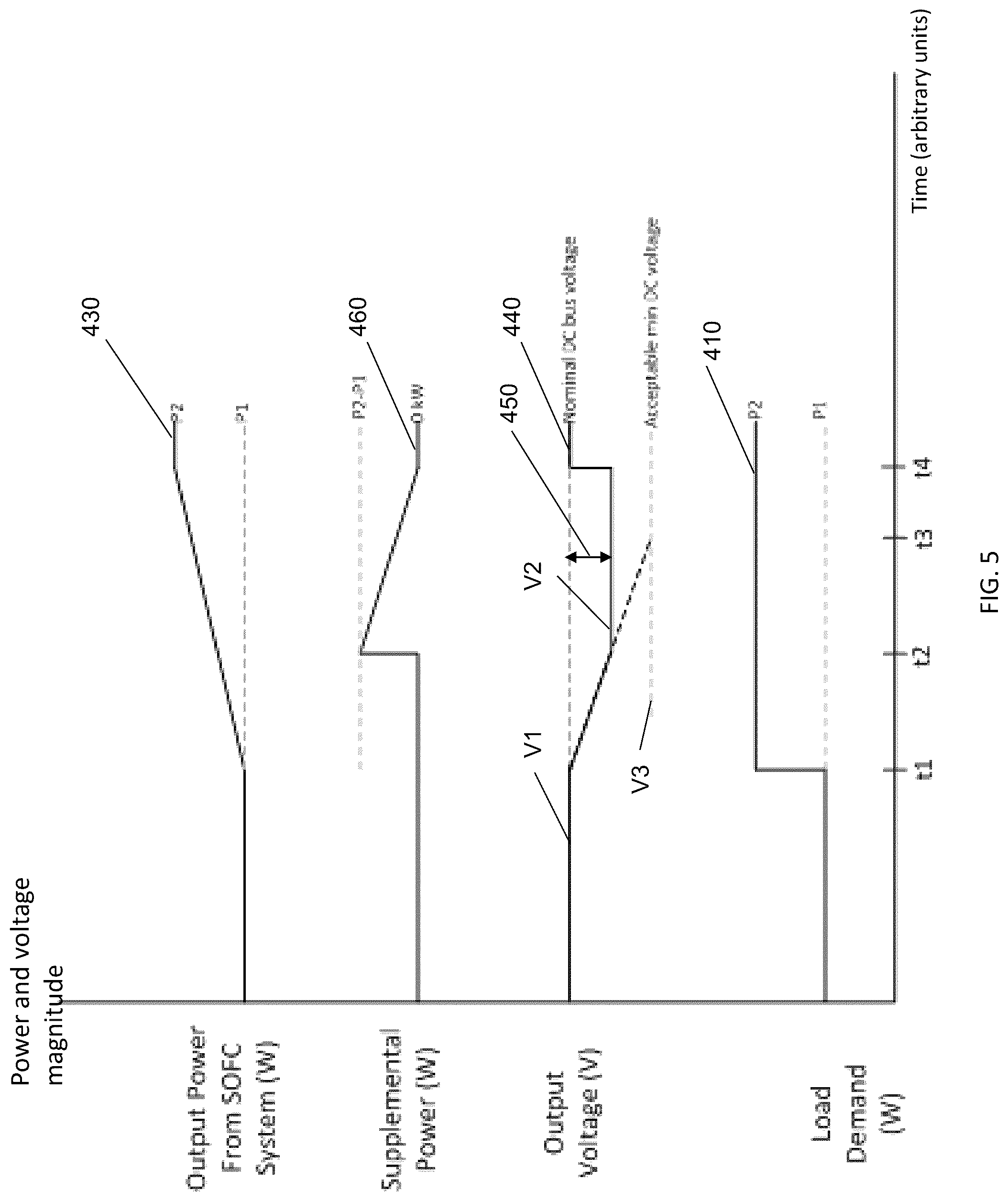 [0058]As shown in FIG. 5, the controller 320b may provide a gradient droop 450 to the UPS 340 which gradually decreases to signal that the SOFC system 320 output power 430 will be increasing gradually at a corresponding rate. For example, the output voltage may decrease from a steady stage voltage value V1 to a lower value. After decreasing at a given rate (e.g., slope) from time t1 to time t2 (which is less than time t4), the output voltage 440 may level off at a constant value V2 at time t2. The constant value V2 of the output voltage 440 is lower than value V1, but is higher than the acceptable minimum DC voltage value V3 that is specified for the DC power bus 380. For example, V3>0.95*V1, and V1>V2>V3. Thus, the droop 450 changes from gradient value (i.e., variable value between V1 and V2) to a constant value V2 at time t2. The slope and maximum value of the gradient droop may indicate the specific value of the supplemental power 460 that should be provided to supplement the SOFC system 320 output power 430 over a given time to meet the load power demand 410. The start of constant value of the droop 450 at time t2 may signal the UPS controller 430d that the information about the output power 430 ramp is completed, and that the UPS controller 430d should begin drawing the supplemental power 460 at time t2. Thus, the system operates in the third mode described above.