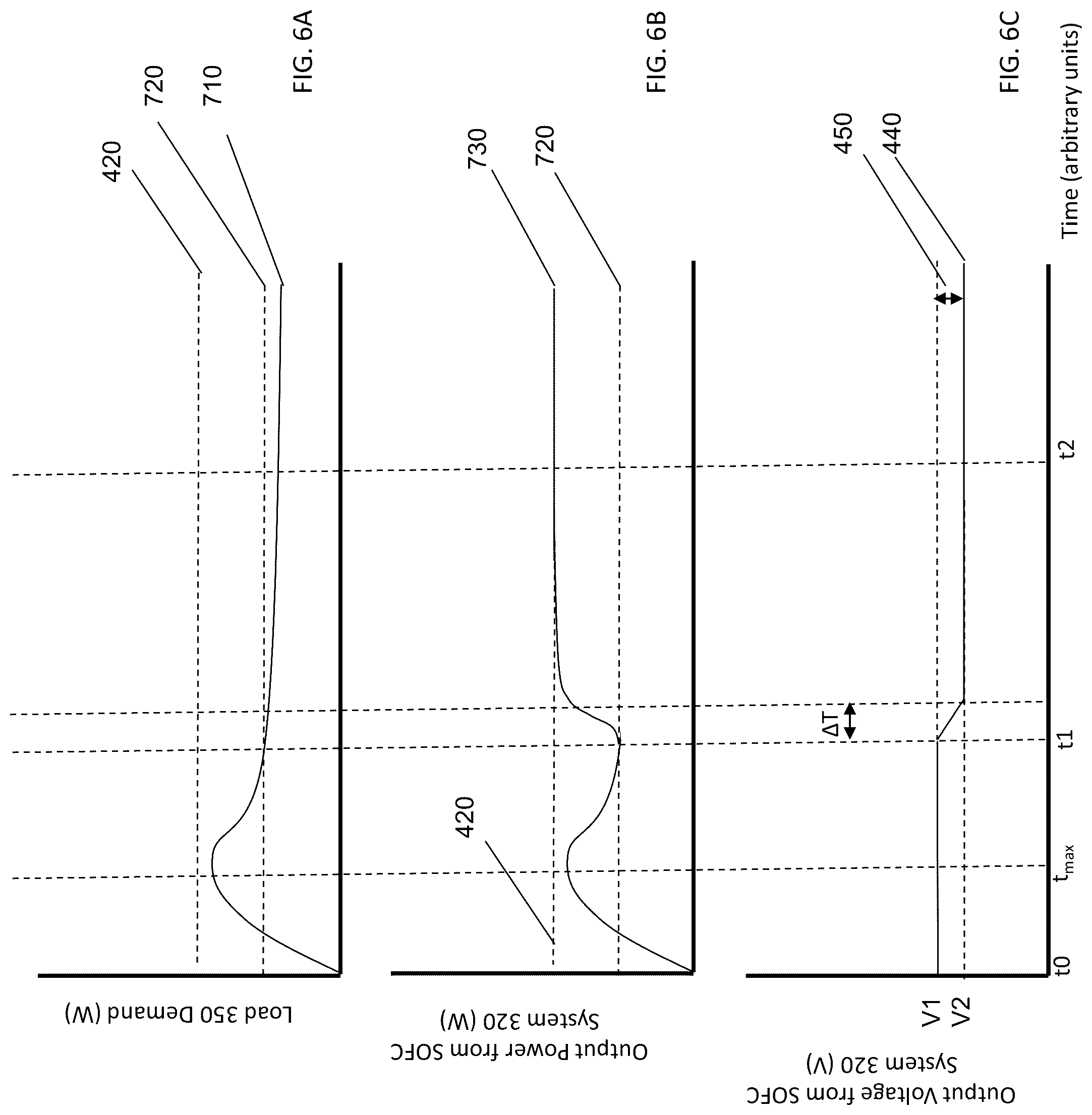 [0067]Although FIG. 6B shows the output power 730 of SOFC system 320 ramping up to its threshold output power 420, is to be understood that the output power may be maintained at other levels between the minimum desired operating power 720 and the threshold output power 420 in this embodiment. For example, it may be advantageous to increase output power 730 from SOFC system 320 to a level at which the SOFC system 320 is operating more efficiently than it would be at the minimum desired operating power 720. Generally, this output power 730 corresponds to a relatively high operating temperature of SOFC system 320 (e.g., above 700° C., such as 800 to 850° C. as discussed above). Thus, in this embodiment, the SOFC system 320 temperature is maintained in the desired operating range (e.g., above 700° C., such as 800 to 850° C.) by maintaining the output power 730 above the load power demand 710 and directing the excess portion of the output power 730 that is higher than the load power demand 710 to the RLB 360. Thus, the direction of power to the RLS 360 can be managed such that the load steps on the SOFC system 320 can be minimized, and a sufficient load on the SOFC system 320 can be maintained to maintain the SOFC system 320 within a desired temperature range. Furthermore, the direction of excess power to the RLB 360 manages the overvoltage on the DC power bus 830 by preventing power flow back from the load 350 into the SOFC system 320.