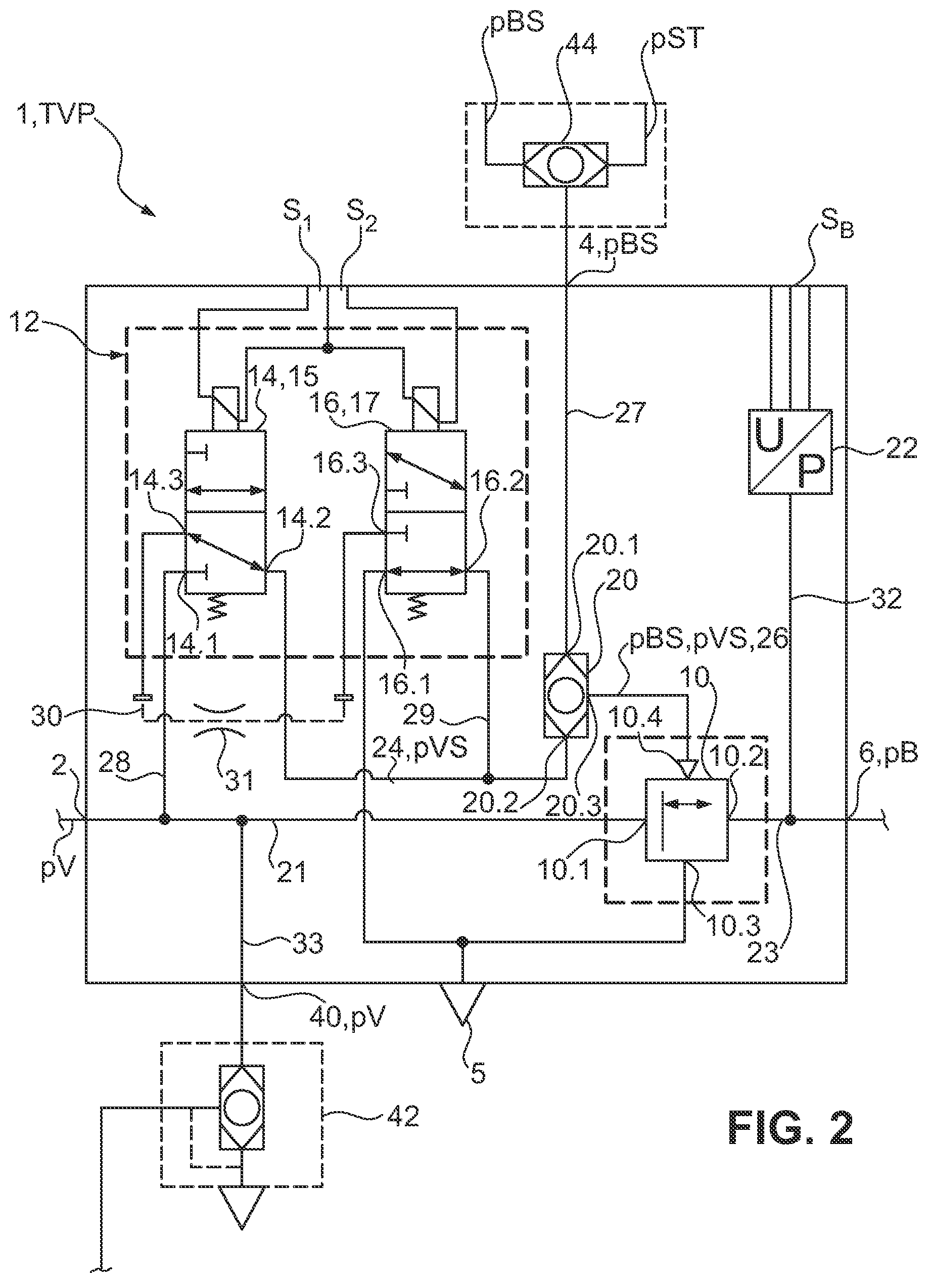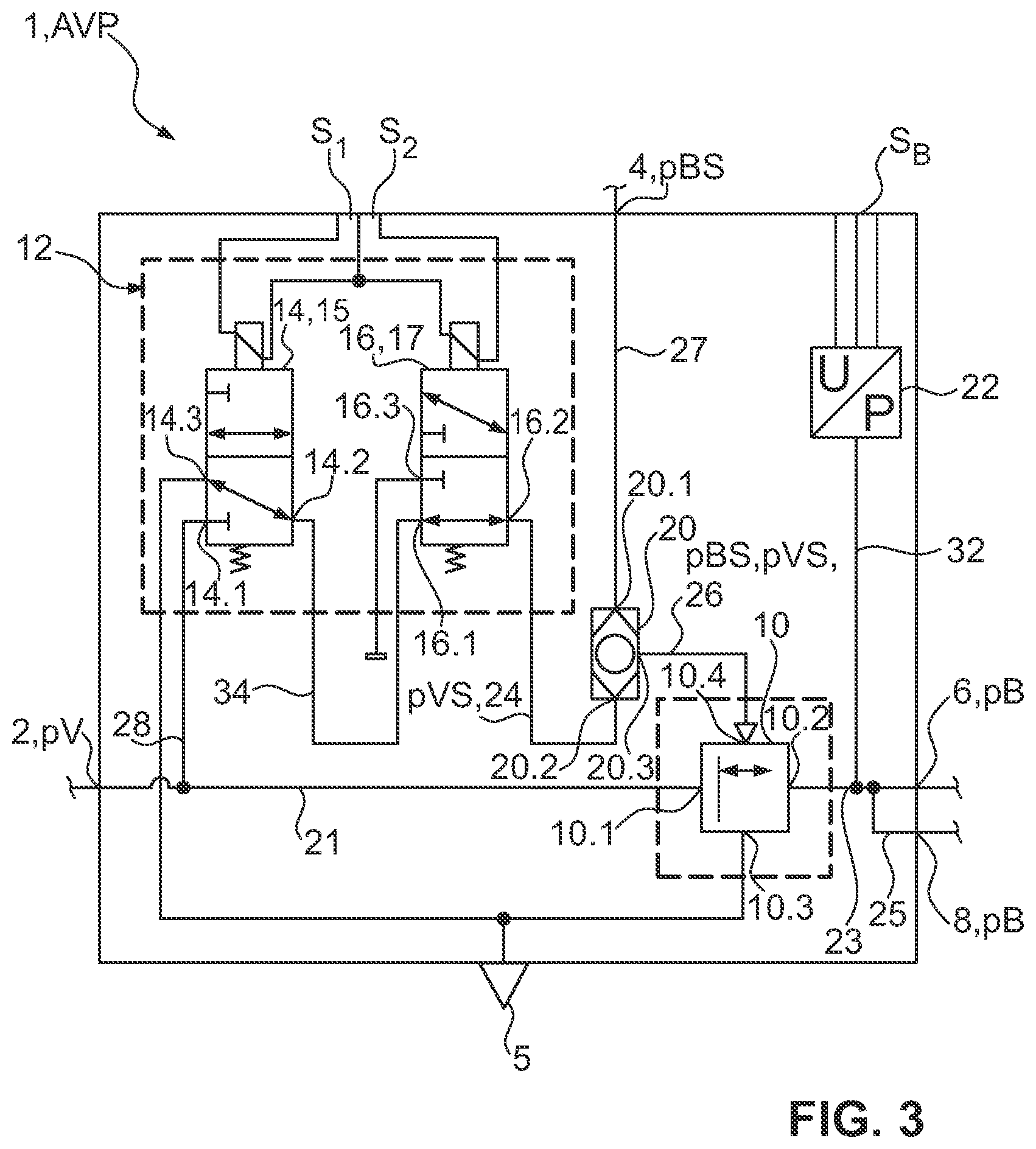 a reservoir connection configured to receive a reservoir pressure; a brake control pressure connection configured to receive a brake control pressure; at least one first service brake connection configured to output a service brake pressure; a relay valve with a relay valve reservoir connection, which is connected to the reservoir connection, a relay valve working connection, which is connected to the first service brake connection, a relay valve ventilation connection, and a relay valve control connection; an electropneumatic pilot control unit, which is connected to the reservoir connection, the electropneumatic pilot control unit being configured to provide a pilot control pressure; and a shuttle valve with a first shuttle valve inlet, a second shuttle valve inlet, and a shuttle valve outlet, wherein the first shuttle valve inlet is connected to the brake control pressure connection to receive the brake control pressure, the second shuttle valve inlet is connected to the pilot control unit to receive the pilot control pressure, and the shuttle valve outlet is connected to the relay valve control connection to output to the relay valve control connection the respectively higher of the brake control pressure or the pilot control pressure; and a) providing a second service brake connection for outputting the service brake pressure for a second vehicle side, or b) providing a trailer supply connection which is provided for connecting to a trailer supply pressure connection, to supply reservoir pressure to a trailer.