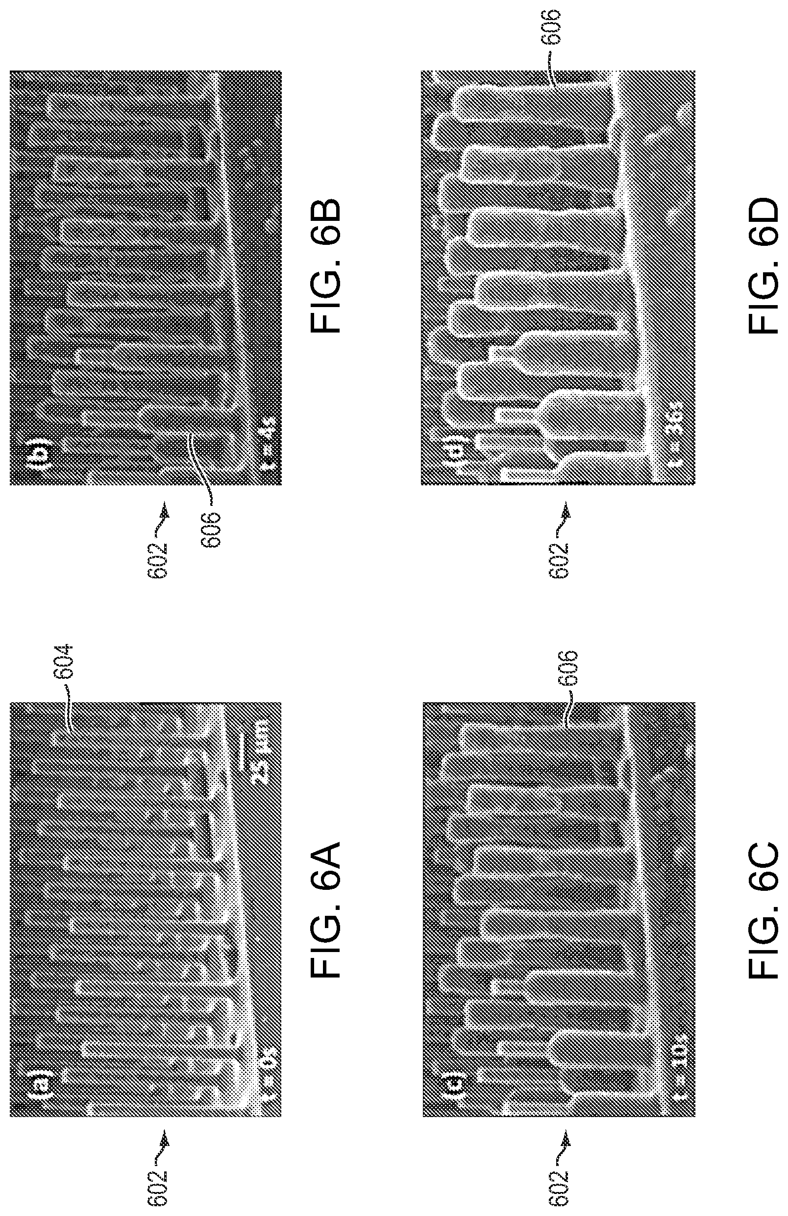 FIGS. 6a-6d include a sequence of ESEM images showing the formation of frost on a gas-impregnated, superhydrophobic surface 602, in accordance with certain embodiments of the invention. The superhydrophobic surface 602 included an array of hydrophobic square posts 604 with width, edge-to edge spacing, and aspect ratio of 15 μm, 30 μm, and 7, respectively. FIG. 6a depicts a dry surface (i.e., no frost), while FIGS. 6b-6d depict the formation of frost 606 on the surface. The intrinsic water contact angle of the hydrophobic coating on the posts was 110°. The surface was maintained at a temperature of −13° C. by means of a cold stage accessory of the ESEM. At the beginning of the experiment, the chamber pressure was maintained at ˜100 Pa, well below the saturation pressure to ensure a dry surface. The vapor pressure in the chamber was then slowly increased until frost nucleation was observed. Frost nucleation and growth occurred without any particular spatial preference on all of the available area, including post tops, sidewalls, and valleys, due to the uniform intrinsic wettability of the surface.