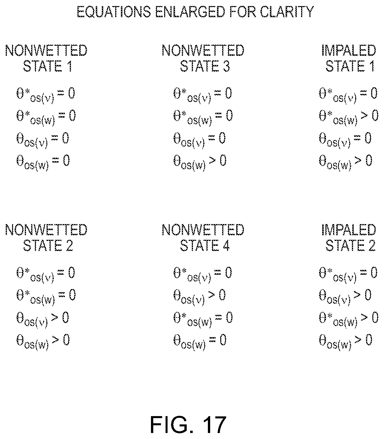 In FIG. 16, Gamma_wv is the surface energy of the non-wetted phase in equilibrium with vapor; Gamma_ow is the interfacial energy between the non-wetted phase and the impregnated liquid; Gamma_ov is the surface energy of the impregnated liquid phase in equilibrium with vapor; Gamma_sv is the surface energy of the solid in equilibrium with vapor; Gamma_so is the interfacial energy between the impregnated phase and the solid; Gamma_sw is the interfacial energy between the solid and the non-wetted phase; r=total surface area divided by projected surface area; Theta_c1, Theta_c2, theta_c3, theta_c4, theta_w1, theta_w2, are the macroscopic contact angles made by the non-wetted phase in each wetting state; Theta*_os(v) is the macroscopic contact angle of oil on the textured substrate when the phase surrounding the textured substrate is vapor; Theta_os(v) is the contact angle of oil on a smooth solid substrate of the same chemistry when the phase surrounding the oil droplet is vapor; Theta*_os(w) is the macroscopic contact angle of oil on the textured substrate when the phase surrounding the oil droplet is water; and theta_os(w) is the contact angle of oil on a smooth substrate of the same chemistry as the textured surface when the phase surrounding the oil droplet is water.