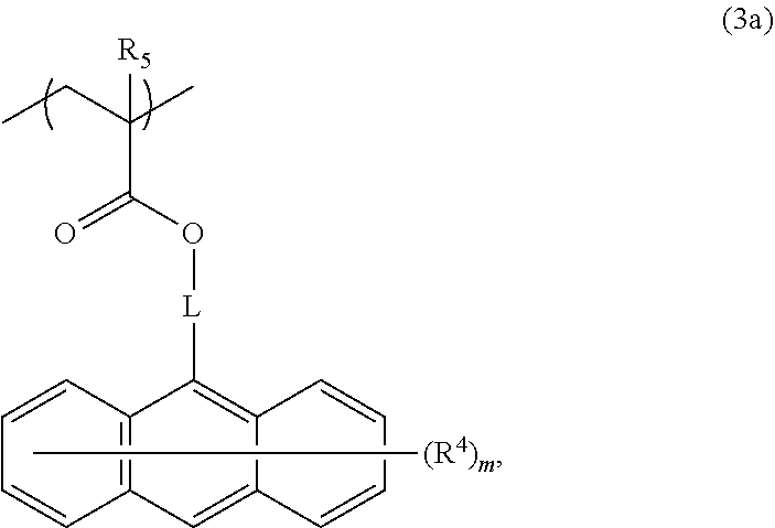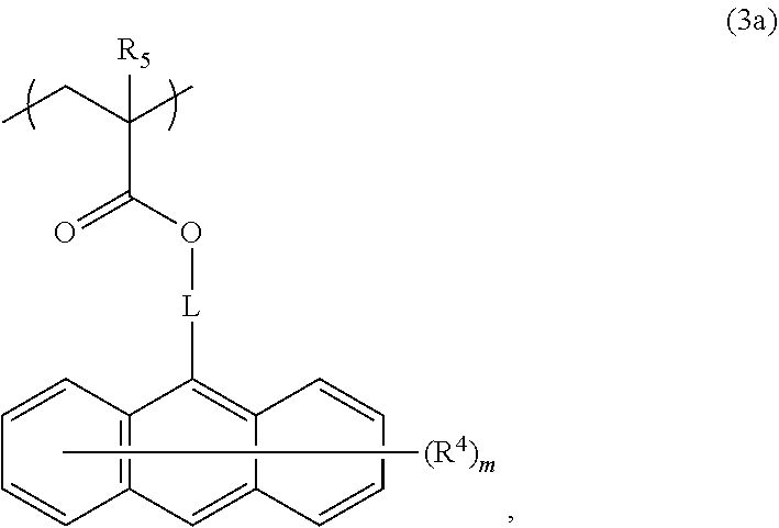 wherein a is an integer from 1 to 5 and Z3is a hydrogen, Z and R5 are independently selected from a hydrogen atom, C1-C4alkyl, C1-C4fluoroalkyl, or cyano; Zi is a non-hydrogen substituent comprising an acid-labile group, the cleavage of which forms a carboxylic acid on the polymer; L is a substituted or unsubstituted C1-C4alkylene; Ar1is a substituted or unsubstituted anthracene group; wherein the first polymer is present in the photoresist composition in an amount of from 0.1 to 10 wt %, based on total solids of the photoresist composition; and
