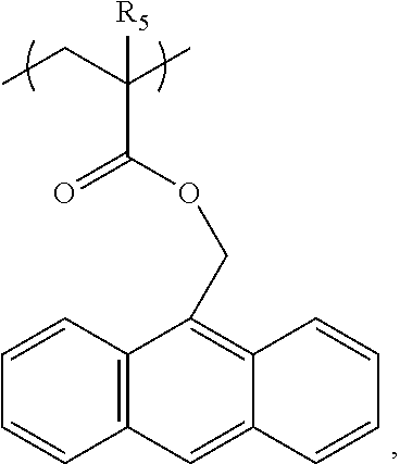 The mole percents for each repeat unit in the respective second polymers are shown above. The photoresist compositions are shown in the Tables 5, 6 and 7. The first polymer is shown as Polymeric DYE—A (below) having a weight average molecular weight of 9,800 g/mole.
