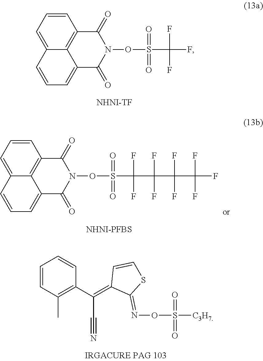 9. The photoresist composition of claim 1, where the photoacid generator has the structure shown in formula (13)