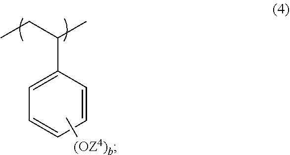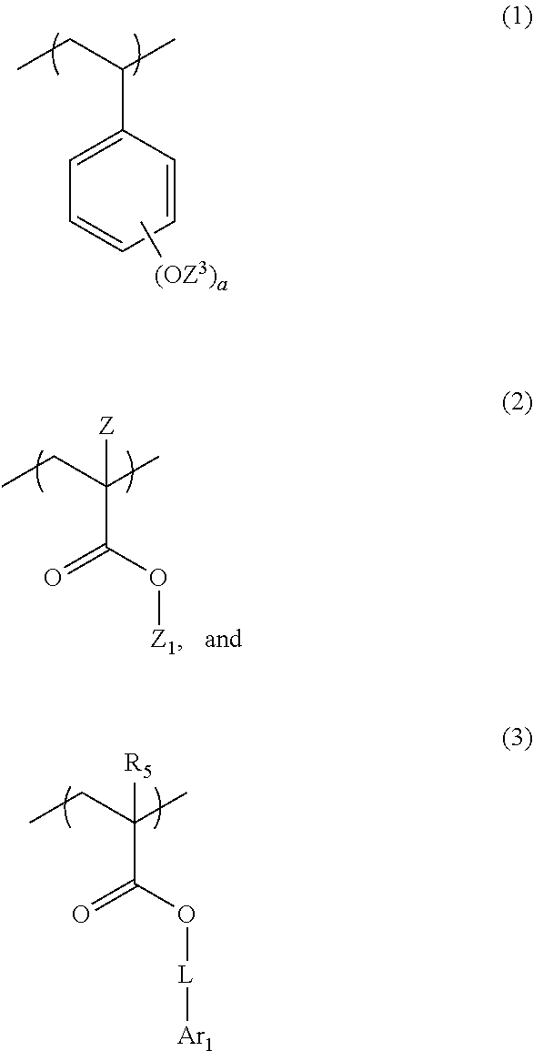 4. The method of claim 3, wherein the first polymerized unit of formula (1) comprises polyhydroxystyrene and wherein the second polymerized unit of formula (2) comprises a tertiary alkyl ester.