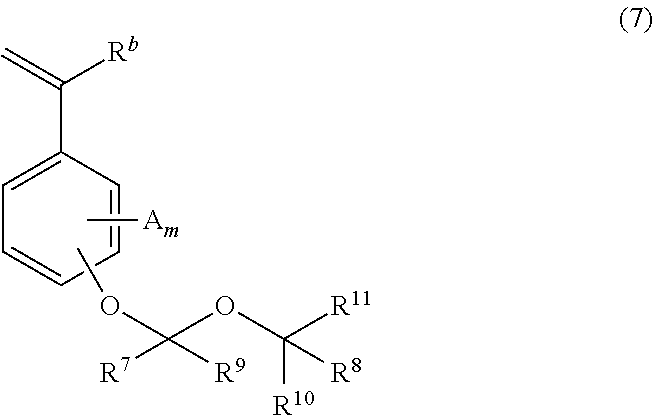 wherein in formula (7), Rbis hydrogen, fluorine, a substituted or unsubstituted C1-5alkyl, or a substituted or unsubstituted C1-5fluoroalkyl; each A is independently a halogen, a hydroxy, a carboxylic acid or ester, a thiol, a straight chain or branched C1-20alkyl, a monocyclic or polycyclic C3-20cycloalkyl, a monocyclic or polycyclic C3-20fluorocycloalkenyl, a monocyclic or polycyclic C3-20heterocycloalkyl, a monocyclic or polycyclic C6-20aryl, or a monocyclic or polycyclic C4-20heteroaryl, each of which is substituted or unsubstituted; and m is independently an integer of 0 to 4;