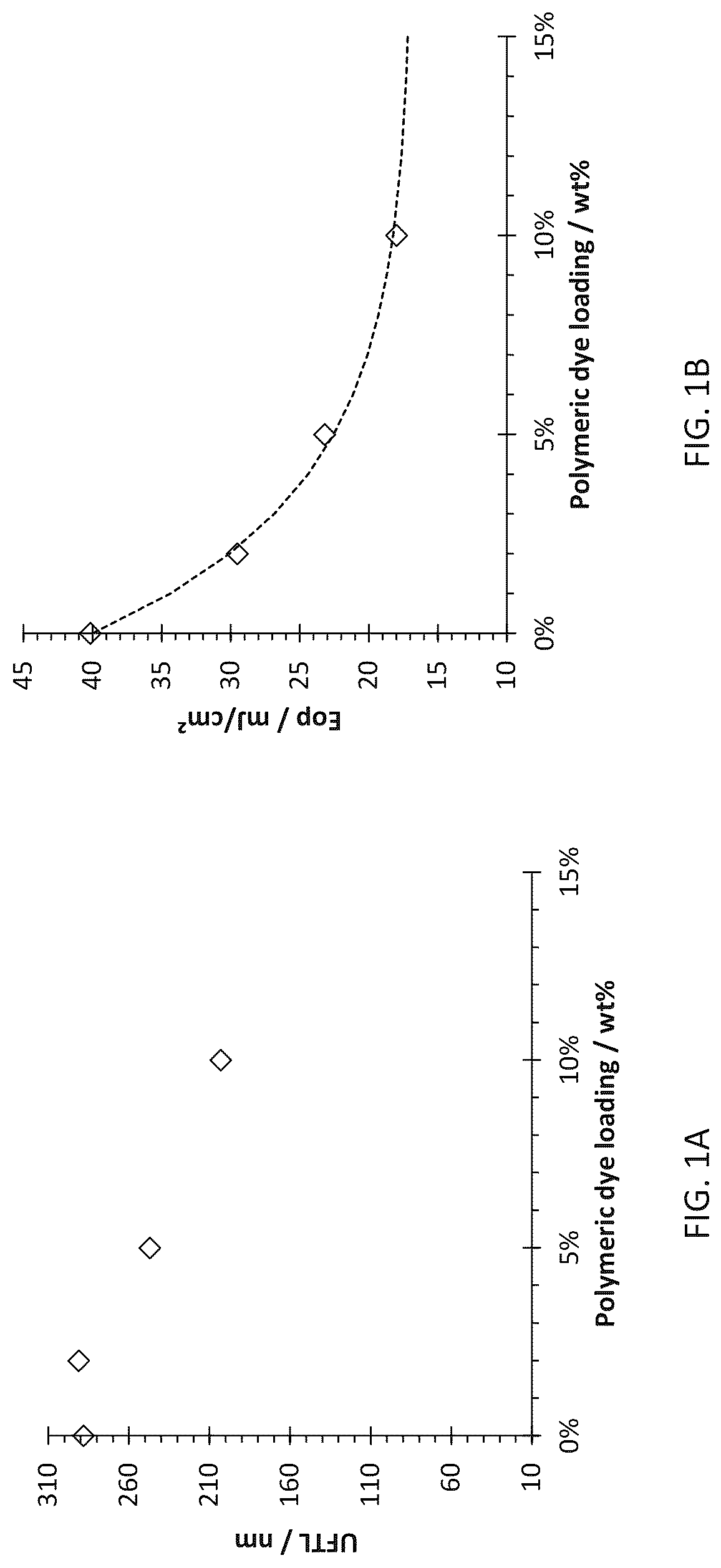 FIG. 1B is a graph that depicts sensitivity (Eop) shift as a function of polymeric dye (first polymer) loading;