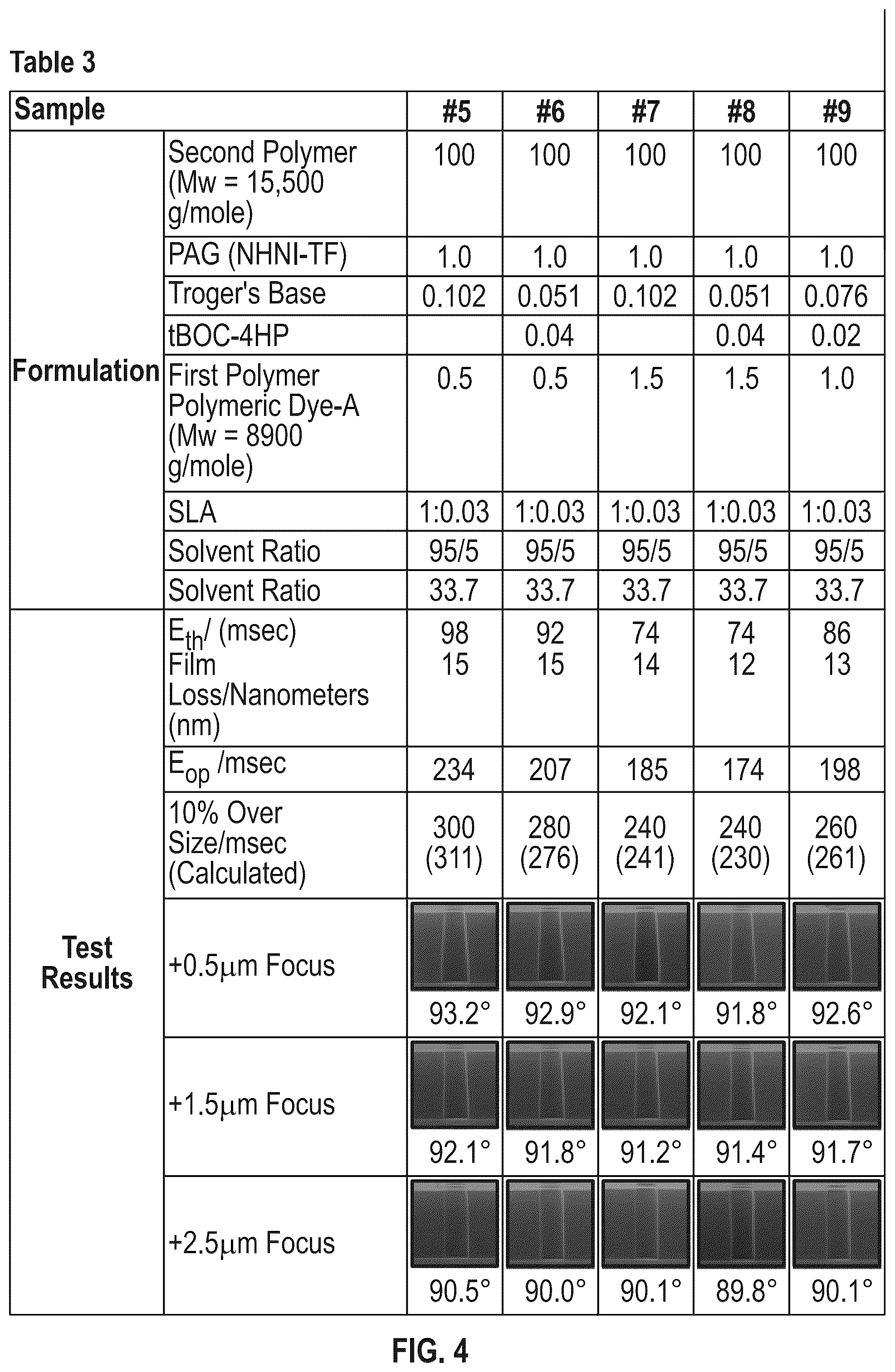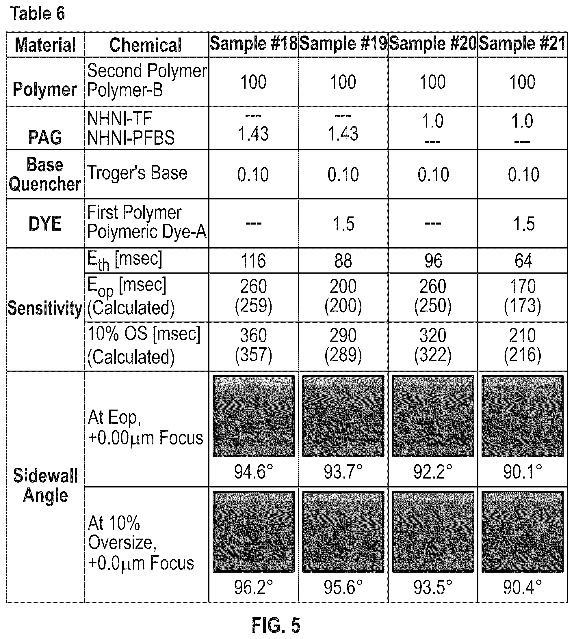 Table 5 details the photoresist compositions, while Tables 6 (FIGS. 5) and 7 (FIG. 6) detail the photoresist compositions along with some of the results.