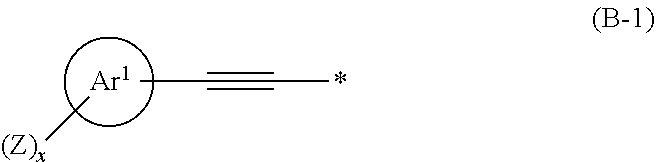 wherein in formula (B-1), Ar1, Z, x and * are as defined above with respect to formula (1), and provided that no substituents of formula (B-1) are in an ortho position to each other on the same aromatic ring of the core. B-staged reaction products of the curable compounds can be prepared by methods known to those skilled in the art. For example, B-staging of the compounds may be conducted by dissolving the compound in a suitable solvent having a boiling point that is greater than the B-staging temperature.