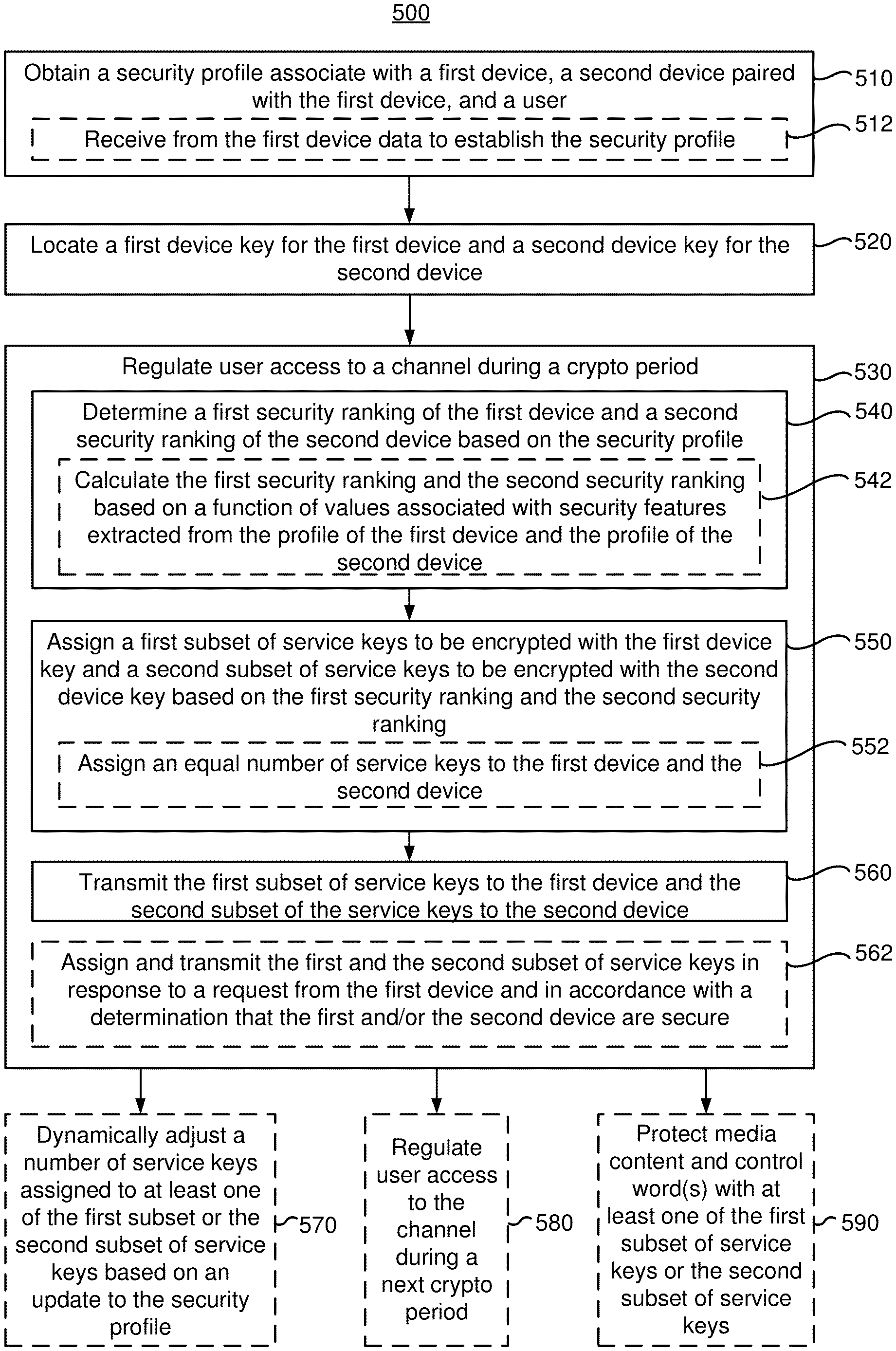 determining a first security ranking of the first device and a second security ranking of the second device based on the security profile, assigning a first subset of service keys to be encrypted with the first device key and a second subset of service keys to be encrypted with the second device key based on the first and the second security ranking, generating a first subset of encrypted service keys by encrypting the first subset of service keys with the first device key and generates a second subset of encrypted service keys by encrypting the second subset of service keys with the second device key; and causing a transmitter to transmit one or more of the first device key and the first subset of encrypted service keys to the first device and transmit one or more of the second device key and the second subset of encrypted service keys to the second device. 10. The headend system of receiving from the first device a user profile of the user, a profile of the first device including an identifier of the first device, a profile of the second device including an identifier of the second device, and data exchanged during pairing of the first device and the second device; and establishing the security profile based on the profile of the first device, the profile of the second device, and the user profile for storage in the non-transitory memory. 11. The headend system of extracting a first set of security features from a profile of the first device and a second set of security features from a profile of the second device; and calculating the first security ranking of the first device and the second security ranking of the second device based on a function of the first set of security features and the second set of security features. 12. The headend system of assigning an equal number of service keys in the first and the second subset of service keys in accordance with a determination that the first security ranking of the first device is approximately the same as the second security ranking of the second device. 13. The headend system of receive a request from the first device to access the channel; determine whether or not at least one of the first device, the second device, or a combination of the first device and the second device is secure to access the channel based on the security profile in response to the request; and perform the assigning, the encrypting, the generating, and the transmitting steps in accordance with a determination that at least one of the first device or the second device is secure to access the channel. 14. The headend system of detect an update to the security profile, including at least one update to a profile of the first device, a profile of the second device, or a user profile of the user; and adjust a number of service keys assigned to at least one of the first subset or the second subset of service keys based on the update. 15. The headend system of determining whether or not a user is entitled to the channel during the next entitlement period based on a user profile of the user; and in accordance with a determination that the user is entitled to the channel, determining a third security ranking of the first device and a fourth security ranking of the second device based on the security profile, assigning a third subset of service keys to be encrypted with the first device key and a fourth subset of service keys to be encrypted with the second device key based on the third and the fourth security rankings, generating a third subset of encrypted service keys by encrypting the third subset of service keys with the first device key and generating a fourth subset of encrypted service keys by encrypting the forth subset of service keys with the second device key, and causing the transmitter to transmit the third subset of encrypted service keys to the first device and the fourth subset of encrypted service keys to the second device. 16. The headend system of the controller is further operable to encrypt one or more control words with at least one of the first subset of service keys or the second subset of service keys and encrypt media content associated with the channel with the one or more control words; and the transmitter is further operable to transmit the encrypted media content and the one or more control words to the first device or the second device. 17. A non-transitory memory storing one or more programs, which, when executed by a controller of a server cause the server to: