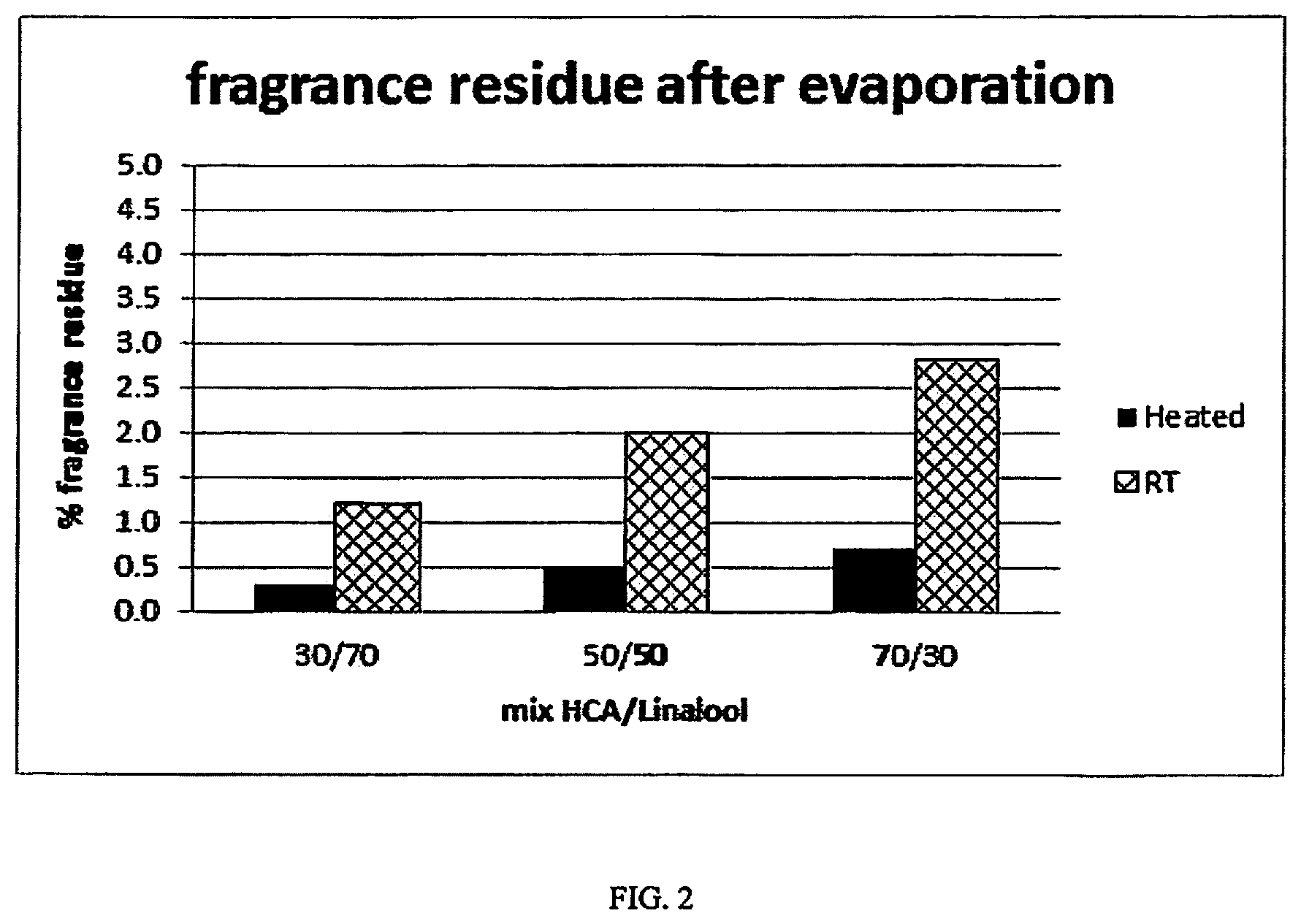 Table 3 (FIG. 2) demonstrates the benefit of heating the water-based fragrance emitters according to the present disclosure, i.e. the percentage of bottom note fragrance ingredients can be increased while at the same time maintaining a minimum amount of residual fragrance material remaining after the end of life of the emitter.