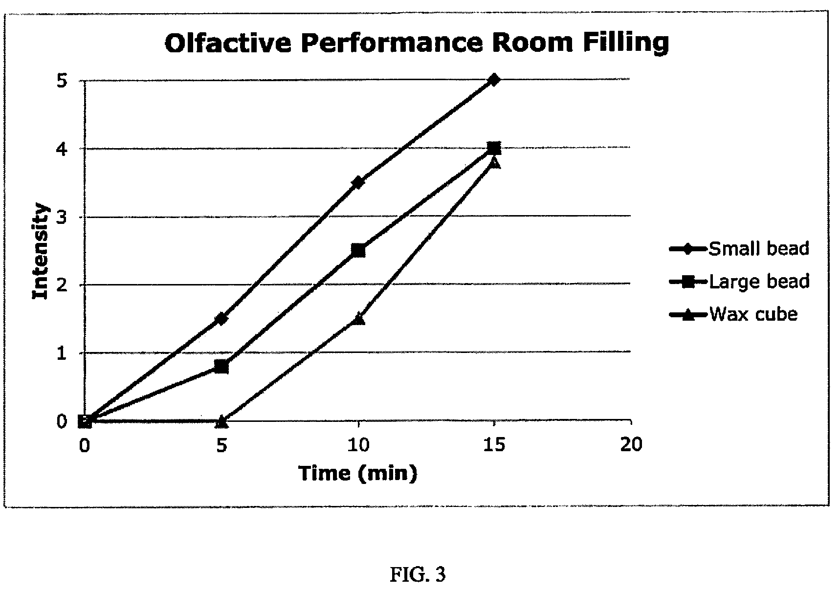 FIG. 3 is a fragrance intensity comparison between different fragrance emitters as described in Example 2.