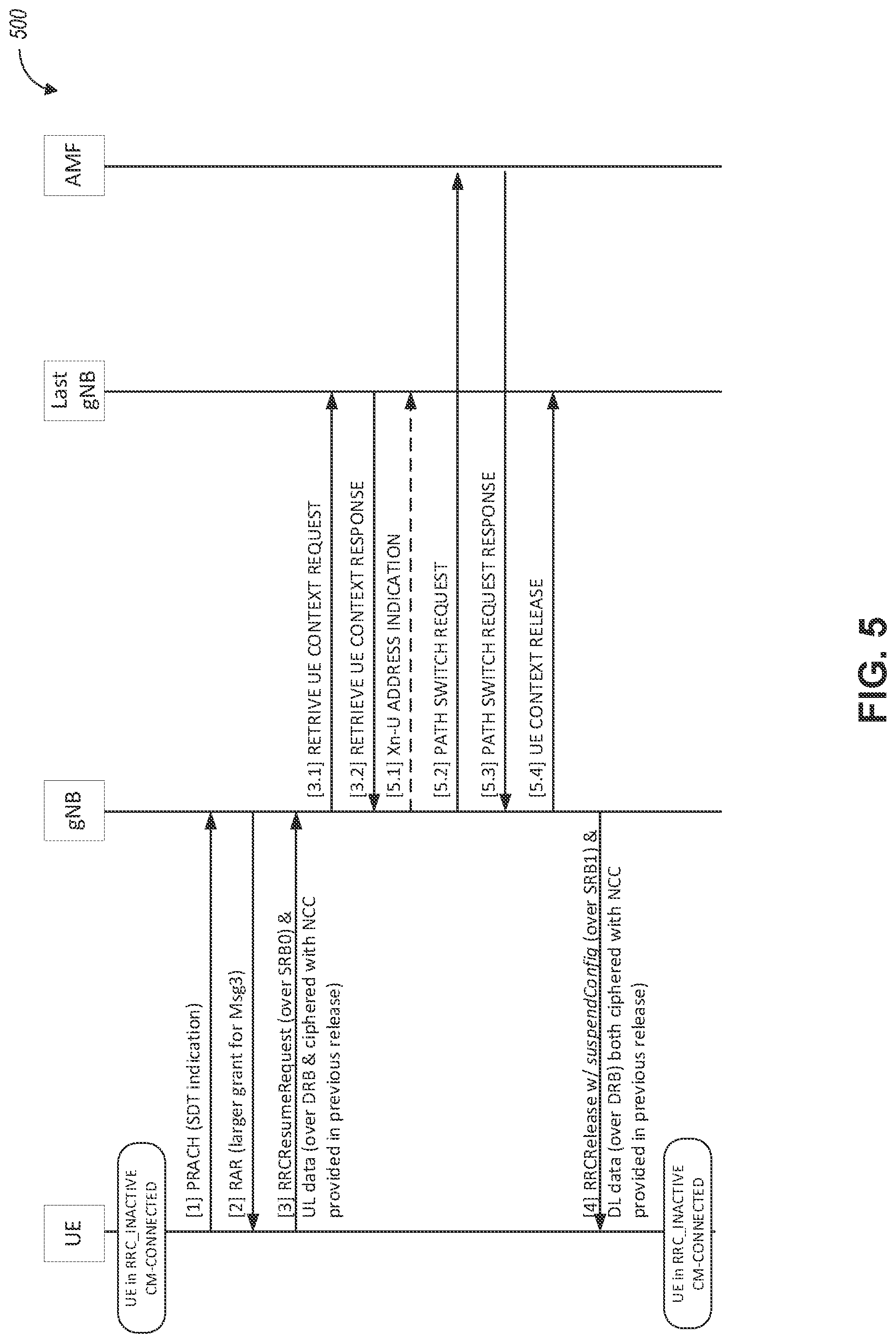 In some aspects, the UL SDT may not be considered successful if the UE does not get the expected DL confirmation, e.g., RRCRelease or, in case of resumption, RRCResume. In aspects when the network triggers a fallback to establish a new RRC connection (via RRCSetup), UL SDT may not be considered successful (e.g., as gNB would not have the security information and/or UE AS context information required to decode it). SDT can be expected to introduce new procedures or changes to the procedure that requires different security handling to normal INACTIVE procedures that impact both the control plane and user plane. The disclosed techniques include the security aspects for the different scenarios. Security handling for the control plane for SDT may need changes to the existing procedures for INACTIVE, such as handling of security keys. For the user plane, the application of the new keys and corresponding re-establishment of the PDCP is described herein. Failure procedures, such as cell reselection during SDT, may be included in the disclosed techniques. It was agreed that UE and network may transfer more than one data packet in the UL and DL during an SDT session. This can be useful as the size of a data field in msg 3 can be limited. It also allows the data to be segmented and sent over multiple TBs if the PDCP SDU size is too large to fit in one TB. This then also increases the overall duration of an SDT session. A consequence of this is that it increases the possibility of cell reselection during an SDT session as shown in The current behavior on cell reselection between an RRC Resume Request and Resume message (T319) is for UE to go to RRC IDLE. In some embodiments, a timer, for example, T319′ can be used to check for failures. The timer is started with the start of SDT transfer, such as sending a Resume Request for SDT. The timer is stopped on receiving some confirmation or completion of the transfer; this could be, for example, an RRC Resume or RRC release. Cell reselection during SDT can be identified as cell reselection while T319′ is running. After cell reselection, T319′ is stopped. A new SDT session can be restarted after completion of cell reselection and UE starts a new SDT session with RACH and T319′ is re-started again. On transitioning to IDLE, the network UE context in gNB is released and any DL data in the gNB is also cleared. If the UE is allowed to go IDLE during an SDT transfer, this data could be lost in the DL without any possibility of recovery or retransmission. In one embodiment, DL data loss is prevented when UE goes to Idle state (e.g., RRC_Idle) but by RAN node sending the data back to the CN (e.g. AMF or UPF) to allow CN to re-send the data to the new RAN node when the UE performs NAS recovery in another cell. After cell reselection, to prevent UL data loss, the UE could repeat data PDCP SDUs in the UL that have not been acknowledged. However, the network may have already received the data but the acknowledgment was not received by the UE. If the PDCP SN for the data is not maintained in the network and UE for the repeated data (such as when UE goes to IDLE), this may result in duplication of the data. UE is also likely to perform many SDT transfers. If the UE goes to IDLE during this cell reselection, data could be lost or duplicated and this could happen frequently. To avoid such data loss or duplication, the UE may continue in INACTIVE after cell reselection such that the UE context and data are not cleared by the gNB, and also the PDCP SNs are maintained in the UE and the network. Depending on when the cell reselection happened, the UE may or may not have received the RRC release with the new NCC before the cell reselection. The network cannot be certain that the UE has received the RRC release with NCC even if it did send it. As there are no measurements from the UEs, the possibility of failure of the RRC message is more likely with SDT than when the UE was RRC CONNECTED. To handle this uncertainty of the value of the NCC in the UE, when the network could try out the old and the new key values to check if the short MAC-I generated with either match the one provided in the Resume Request and pick the one that matches. The network may subsequently provide the UE with a new NCC to re-sync the network and UE with a new key as discussed above. The UE may not have received the RRC release message with the new NCC during the SDT session. In the absence of a new NCC to generate a new key for the next SDT session, there is a possibility of security risk from re-using the old key. For INACTIVE, new NCC is provided in RRC Release message and used by the UE for SRBs and DRBs except Resume Request is sent over SRB0 with short MAC-I calculated using the old NCC. Although the use of new NCC may not be essential for all new SDT sessions, this INACTIVE mechanism can be re-used for RRC based SDT, both with and without anchor relocation, as it ensures the principle that a security key is not re-used in different nodes. As discussed above, data loss may occur if the UE goes to Idle, for example after cell reselection, during SDT transfer and UE has to continue in an INACTIVE state to avoid data loss. Security during the new Resume Request in a new cell may use the following additional consideration as new NCC may not be provided to the UE before the cell reselection.