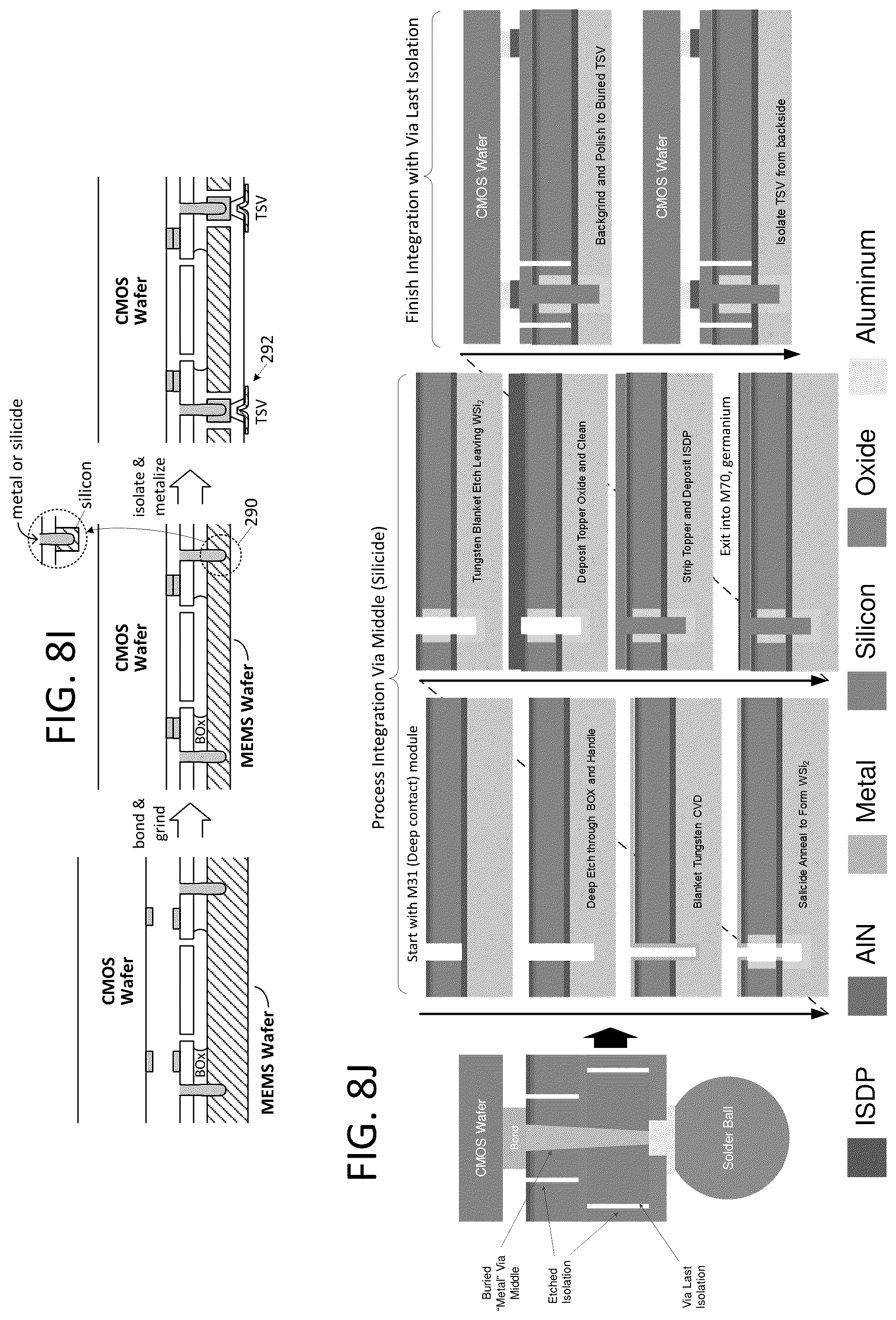 [0019]FIGS. 8I and 8J illustrates a two-phase (or multiple-phase) TSV implementation in connection with face-to-face MEMS-to-CMOS wafer bonding;