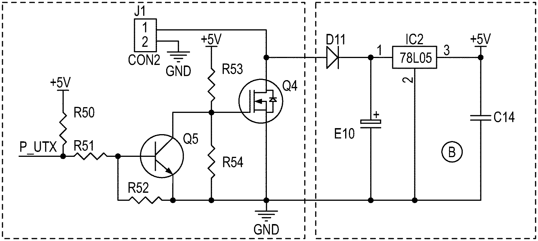 FIG. 16 is a second circuit diagram of the auxiliary power carrier serial port circuit and the sub-control power extraction circuit in FIG. 13 according to the present disclosure. The auxiliary power carrier serial port circuit B1 includes a communication port J3, a resistor R50, a resistor R51, a resistor R52, a resistor R53, a resistor R54, a field-effect transistor Q4 and a triode Q5. The sub-control power extraction circuit B2 includes a diode D11, an electrolytic capacitor E10, a voltage stabilizing module IC2 and a capacitor C14.