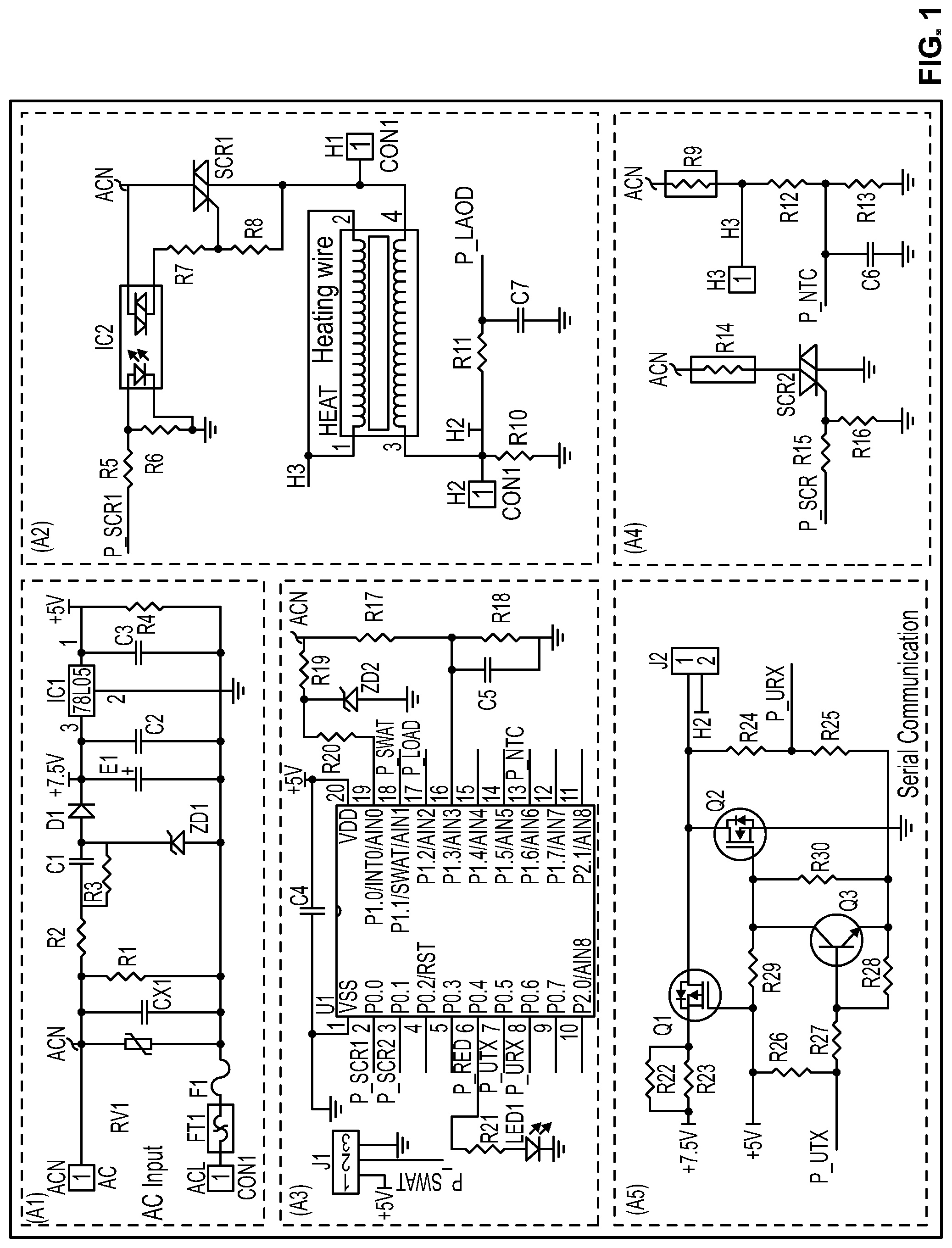 The MCU main control circuit A3 acquires operating state information and mains power related information of the heating main loop A2 through the active/passive protection circuit A4, the heating main loop A2 and itself. FIG. 14 is a second circuit diagram of the MCU main control circuit in FIG. 12. The MCU main control circuit includes a main MCU which has 14 pins and controls each output point to be turned on or off according to a predetermined program algorithm. The first pin of the main MCU is grounded, the 14th pin of the main MCU is connected to a +5 V output end of the relatively low voltage power conversion circuit, a capacitor C4 is arranged between the first pin and the 14th pin, the 13th pin of the main MCU is connected to a first end of a resistor R20, a second end of the resistor R20 is connected to a first end of a resistor R19 and a cathode of a voltage stabilizing diode ZD2, and an anode of the voltage stabilizing diode ZD2 is connected to a common terminal GND; a second end of the resistor R19 and a second end of a resistor R17 are connected to an ACN end, a first end of the resistor R17 is connected to the 10th pin of main MCU, a first end of the capacitor C5 and a first end of a resistor R18, a second end of the capacitor C5 and a second end of the resistor R18 are connected to the common terminal GND, the 5th pin of the main MCU is connected to a first end of a resistor R21, a second end of the resistor R21 is connected to an anode of a light-emitting diode (LED) 1, and a cathode of the LED 1 is connected to the common terminal GND; a first pin of a programming port J1 is connected to the +5 V output end, a second pin of the programming port J1 is connected to the 12th pin of the main MCU, and a third pin of the programming port J1 is connected to the common terminal GND.