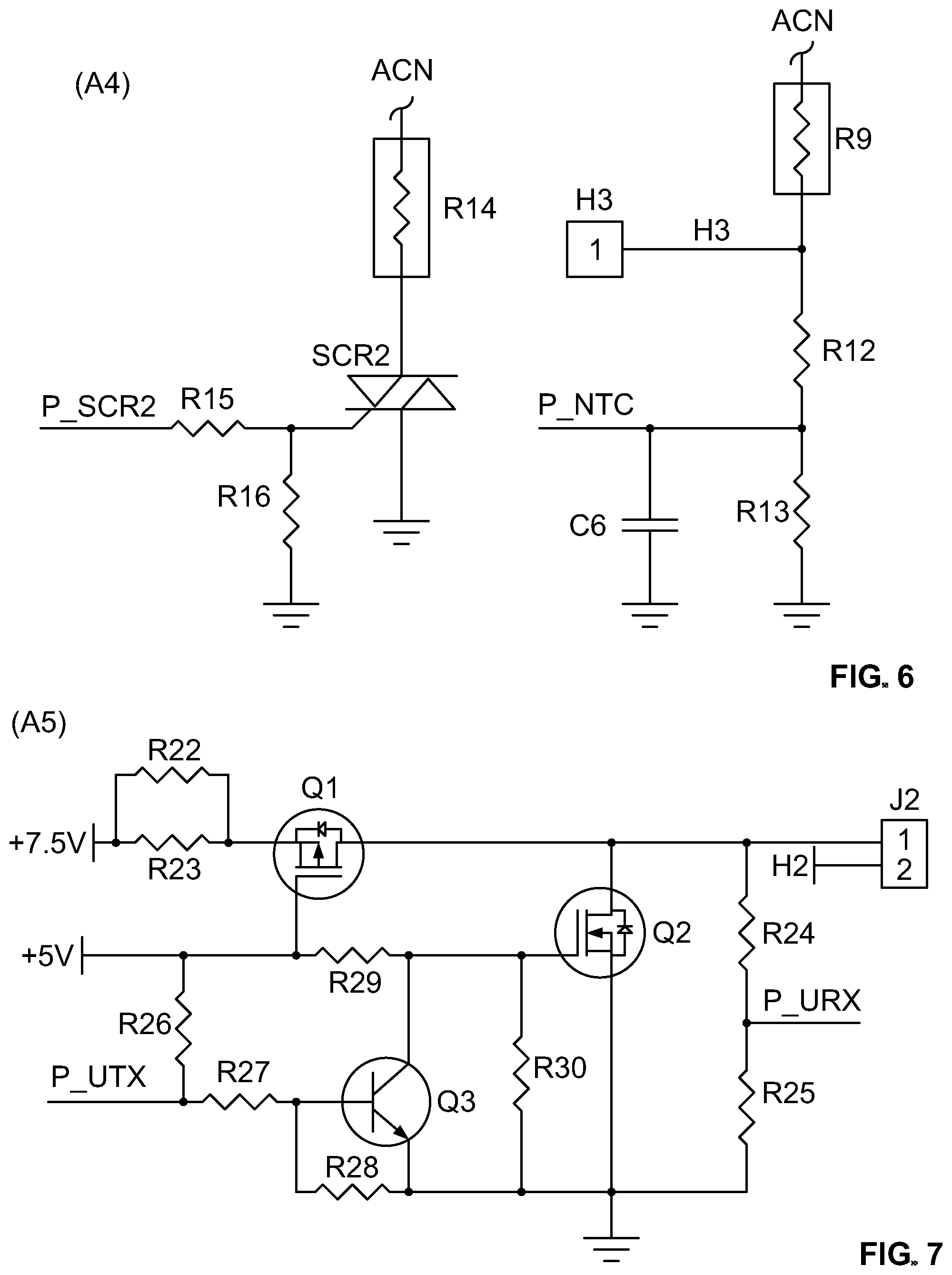 FIG. 15 is a second circuit diagram of the main power carrier serial port circuit in FIG. 12 according to the disclosure. The main power carrier serial port circuit A5 includes a resistor R22, a resistor R23, a diode D3, a diode D4, a communication port J2, a resistor R24 and a resistor R25. A first end of the resistor R22 and a first end of the resistor R23 are connected to a first power supply, a second end of the resistor R22 and a second end of the resistor R23 are connected to an anode of the diode D4, a cathode of the diode D4 and a cathode of the diode D3 are connected to a first end of the resistor R24, the first end of the resistor R24 is further connected to a first pin of the communication port J2, a second end of the resistor R24 and a first end of the resistor R25 are connected to a 6th pin of a main MCU, a second end of the resistor R25 is connected to a common terminal GND, and a second pin of the communication port J2 is connected to a point H2 in the heating main loop A2.