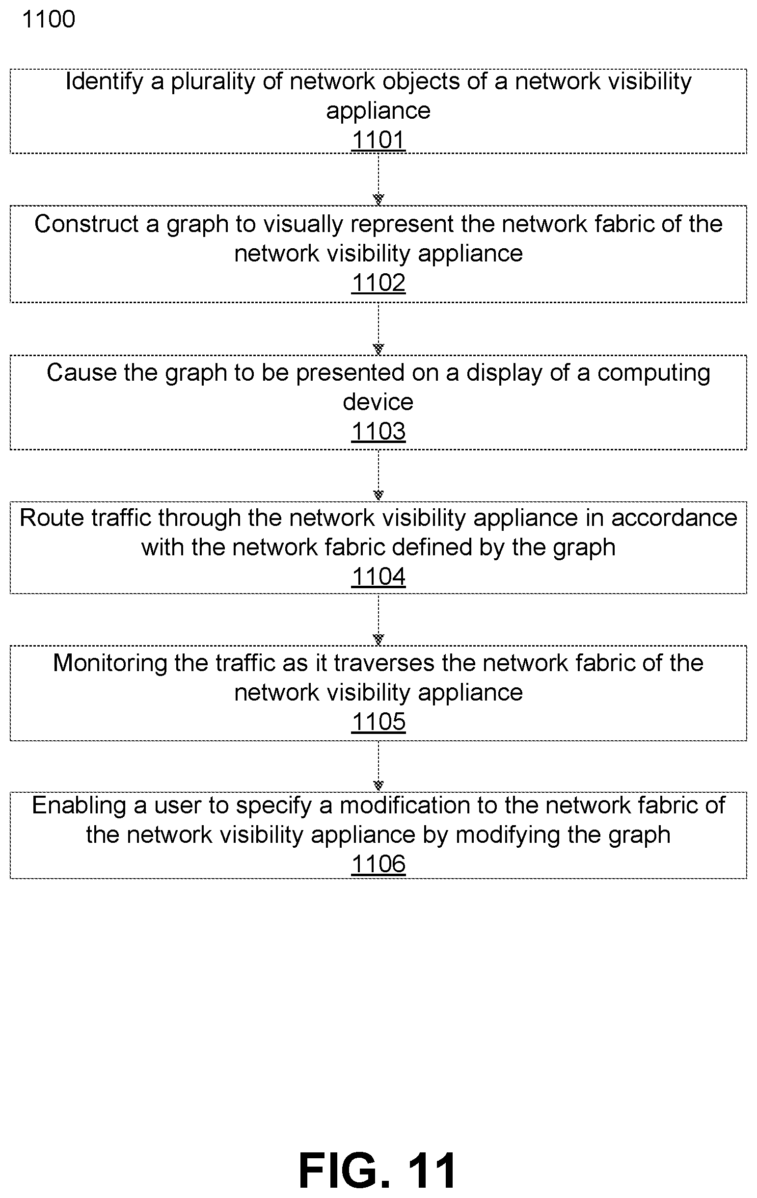 A rule component (r) is a specific filtering criterion for matching packets (e.g., based on address, protocol, source port, destination port, or some other packet criteria). As shown in The action set may list a node corresponding to a tunnel endpoint or an application endpoint. Here, for example, ActionSet_4 lists node A1 (which corresponds to an application endpoint). In such instances, the programmable switch directs matching data packets to the specified node, which causes the matching data packets to once again be governed by Table_0. The action set may also specify that matching data packets should be forwarded to another table corresponding to another map. Here, for example, ActionSet_3 causes traffic to be forwarded to Table_3, which represents another map. Traffic can be replicated as necessary when leaving a node that has more than one outgoing connection (e.g., when the action set specifies multiple destinations). Multiple rules may be associated with a single action set. Here, for example, rule one (R1) and rule two (R2) are affiliated with ActionSet_0, while rule three (R3), rule four (R4), and rule five (R5) are affiliated with ActionSet_2. Generally, these links to action sets are fixed once the map has been constructed and programmed into the programmable switch. However, because each map is assigned to its own table, an end user may be able to easily add, remove, or modify maps by adding new tables, removing existing tables, or modifying entries in existing tables. In some embodiments, each rule is assigned a specific priority. Priorities can range from 0-99, where a larger number denotes a higher priority. Higher priority rules can then be evaluated before lower priority rules. In some embodiments no specific execution order may be guaranteed for rules having the same priority, while in other embodiments rules having the same priority are executed in the order in which they reside in the programmable flow table. The links described above between the various programmable flow tables are generally simple, passive links. However, the links could be made more intelligent. For example, the programmable switch may add quality of service (QoS) policies to certain links, stamp incoming data packets with particular metadata (e.g., a timestamp or unique identifier), modify the IP addresses of outgoing data packets, etc. Note that the same techniques could be implemented using a single table that is partitioned into multiple (logical) zones. For example, a first group of rows may be allocated to the network objects capable of receiving incoming virtualized traffic, a second group of rows may be allocated to a first map, and a third group of rows may be allocated to a second map. The programmable flow tables shown in The client can then construct a graph to visually represent the network fabric of the network visibility appliance (step 1102). Each network object of the plurality of network objects can be displayed as a node in the graph, while traffic flows between pairs of network objects can be displayed as edges (also referred to as “connections”) between pairs of nodes in the graph. The client can then cause the graph to be presented on a display of a computing device (step 1103). For example, an end user (e.g., a network administrator) may wish to view the graph to see how traffic is being routed through the network visibility appliance. The network visibility appliance can then route traffic in accordance with the network fabric defined by the graph (step 1104). In some embodiments, the traffic is monitored as it traverses the network fabric of the network visibility appliance (step 1105). For example, the network visibility appliance could generate statistics regarding how the traffic is routed between the plurality of network objects. Such statistics may be useful to identify bottlenecks in the network fabric, the popularity of certain traffic types, etc. The client may also enable the end user to specify a modification to the network fabric of the network visibility appliance by modifying the graph (step 1106). For example, the end user could add a new node/connection, delete an existing node/connection, and/or alter a characteristic of an existing node/connection. In such instances, the client may transmit a notification specifying the modification to a controller responsible for causing the modification to be implemented by the network visibility appliance. Dynamic Service Chaining and Late Binding A service chain refers to a set of network services that are interconnected through a network fabric to support a particular application. Thus, service chaining refers to the provisioning of network services for the particular application. As shown in Network services are often implemented by applications and/or network tools that are communicatively to a network visibility appliance of a visibility platform. However, network services could also be implemented by, for example, firewalls or application delivery controllers (ADCs). Because the network fabric of the network visibility appliance can be represented as a graph (e.g., a DAG) that makes use of action sets, service chains can be readily created, destroyed, and modified on demand. This makes the processes of network management and application replacement/upgrade easier. As noted above, each node of the graph can be affiliated with an action set (i.e., a group of one or more actions that are applied together). Multiple types of actions may be supported by a network visibility appliance, including: (1) dropping some or all of the traffic; and (2) directing the traffic to another network object represented as another node in the graph. When dealing with the type of graph shown in The client can then receive a service chain arrangement indicative to the network visibility appliance of how to route data packets through a sequence of network object(s) that provide specified network service(s) (step 1302). Examples of netw
