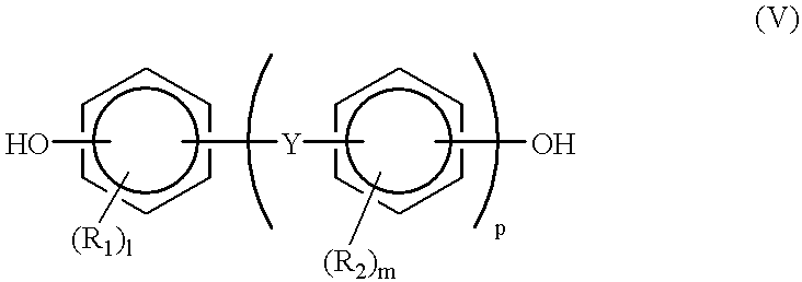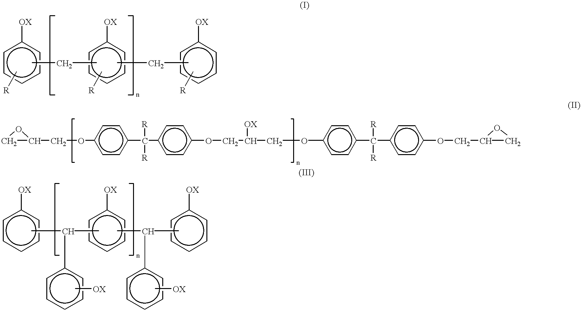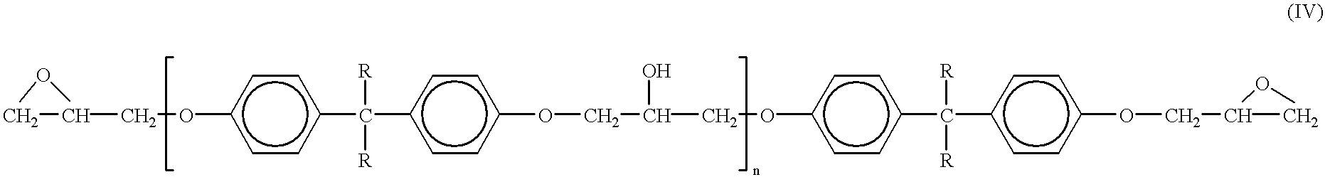 [0018] can be obtained by reaction of the hydroxyl group of bisphenol A type epoxy resin and bisphenol F type epoxy resin represented by the following formula (IV) with epichlorohydrin. To promote the reaction of the hydroxyl group with epichlorohydrin, it is preferable to carry out the reaction at a reaction temperature of 50° to 120° C. in the presence of an alkali metal hydroxide in a polar organic solvent such as dimethylformamide, dimethyl-acetamide, dimethyl sulfoxide, etc. When the reaction temperature is below 50° C., the reaction will be retarded, whereas above 120° C. many side reaction will occur unpreferably.