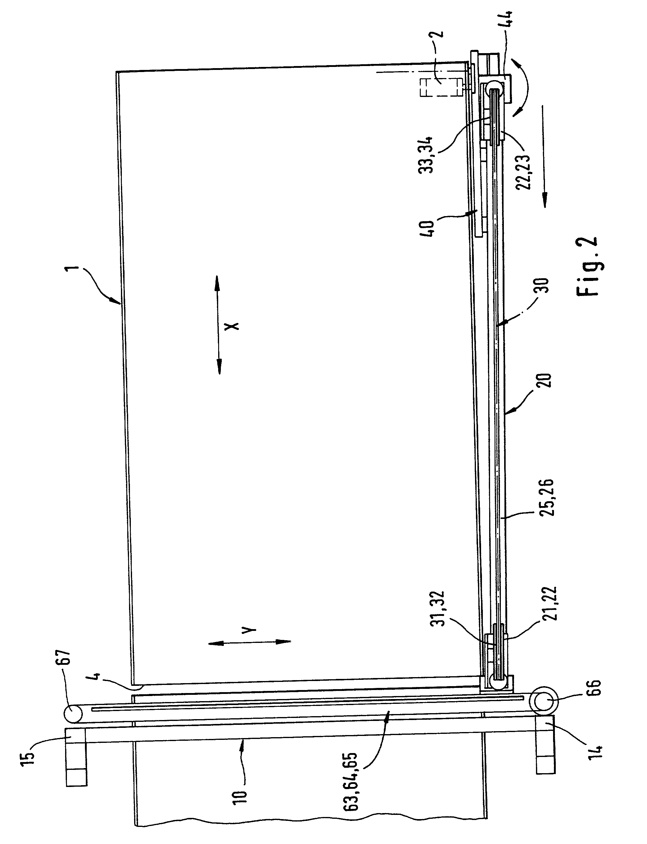 [0001] The invention relates to a contour-cutting machine, in particular for foam, comprising a workpiece table with a gap in it, a stationary frame around the table, an endless cutting element through the gap and means for driving the cutting element along the gap. [0002] It has been practice to construct contour-cutting machines, with a vertical cutting element in the cutting region, which is guided through a gap in the workpiece table (European patent 0 738 569 A1, inventor: Hueskens). The cutting assembly comprises an open gantry in which there are installed four deflecting pulleys for the cutting element, and the gantry can be displaced in its entirety in order to guide the cutting element along the table gap. In a first embodiment, the main plane of the cutting gantry coincides with the table-gap plane, and such gantry has double the width of the workpiece table making the all-over dimension of the machine very extensive. In the second embodiment, the main plane of the gantry extends perpendicularly to the table gap, and the full width of the contour-cutting machine does only exceed the width of the workpiece table to a small extent, but the gantry has to be designed with high level of rigidity, this resulting in large masses having to be moved. [0003] In order to avoid large masses having to be moved, it is already known from my previous invention (European patent 0 390 939 A1) to provide a stationary cutting-assembly carrier with a top and bottom tool carriage or slide, between which the cutting element is tensioned and which are displaced parallel to the table gap. In the case of a continuous band knife as the cutting element, a storage loop is formed, the latter supplying the missing band-knife length and/or taking up the excess band-knife length. The loop formation of the band knife is not desirable and can be avoided by a contour-cutting machine designed according to a further invention of mine (German publication 195 49 458 A1). However, the stationary frame, which encloses the workpiece table in the vicinity of the table gap, is of double the table width. Four pulleys are used in order to tension and to guide the cutting element in rectangular form. Each of the pulleys in this case is seated on its own carriage or slide and is displaced synchronously on guides parallel to the table gap. Smaller masses are moved as a result. However, the large width of the stationary frame is not desirable. [0004] It is an object of the present invention to provide a contour-cutting machine which is particularly suitable for foam. [0005] It is another object of the invention to keep the moving masses comparatively small. [0006] It is still another object of the invention to guide the cutting element on a straightforward path. [0007] It is a further object of the invention to keep the machine width practically within the width of the workpiece table. [0008] With invention, use is made of a movable cutting-element carrier which bears the pulleys, and transmits the forces from dead weight, tensioning forces and cutting forces to stationary machine parts over a short distance, with the result that the movable cutting-element carrier can be made up of structural elements which are thin and thus do not have a particularly large mass. A first vertical side of the cutting-element carrier is open and the ends of the cutting-element carrier are supported on the stationary frame which encloses the workpiece table in the vicinity of the table gap, so that the ends of the cutting-element carrier may travel parallel to the table gap. That side of the movable cutting-element carrier which is located opposite the cutting region is similarly guided and supported on a stationary machine part extending along one side of the workpiece table. [0009] The cutting element used may be a so-called polydirectionally cutting wire, or a band knife. If use is made of a band knife, the cutting edge of the latter has to be aligned tangentially to the cutting contour and, for this purpose, use is made of a band-knife-rotating device which is shifted synchronously with the cutting-region or open side of the cutting-element carrier, and is supported on the stationary frame. [0010] It is possible for the cutting-element carrier, in one position, to extend parallel to the workpiece table, and straightforward accessibility to the cutting element is given in this position, with the result that said cutting element can be removed from the pulleys and exchanged. It is also possible for the cutting-element carrier to be moved into a position in which the cutting element has passed through the table gap, in which case the cutting-element carrier then extends transversely or diagonally to the workpiece table. In other words, the ends or corners of the cutting element carrier are shifted along paths which are perpendicular to one another and are formed by guideways extending along one side of the workpiece table and through the table gap. [0011] The invention will be described with reference to the drawings, in which [0012] [0013] [0014] [0015] [0016] The main parts of the contour-cutting machine are a workpiece table 1 with a drive 2 for movement in the longitudinal direction X, a stationary frame 10, a movable cutting-element carrier 20, an endless cutting element 30, a stationary machine upright 40, a drive device 60 for movement in the transverse direction Y and a knife-rotating device 70. [0017] The workpiece table 1 has a longitudinal drive 2 for moving a workpiece 3 in the X-direction, it being possible for the drive 2 to contain one or more actively driven head rollers which tension and drive a band system as is described in European publication 0 738 569 A1, which is incorporated by reference. It is also possible for the drive for the workpiece 3 to comprise pushing elements, as described in European publication 0 390 939 A1 incorporated by reference. Arranged in the transport path of the workpiece table 1 is a table gap 4, ex