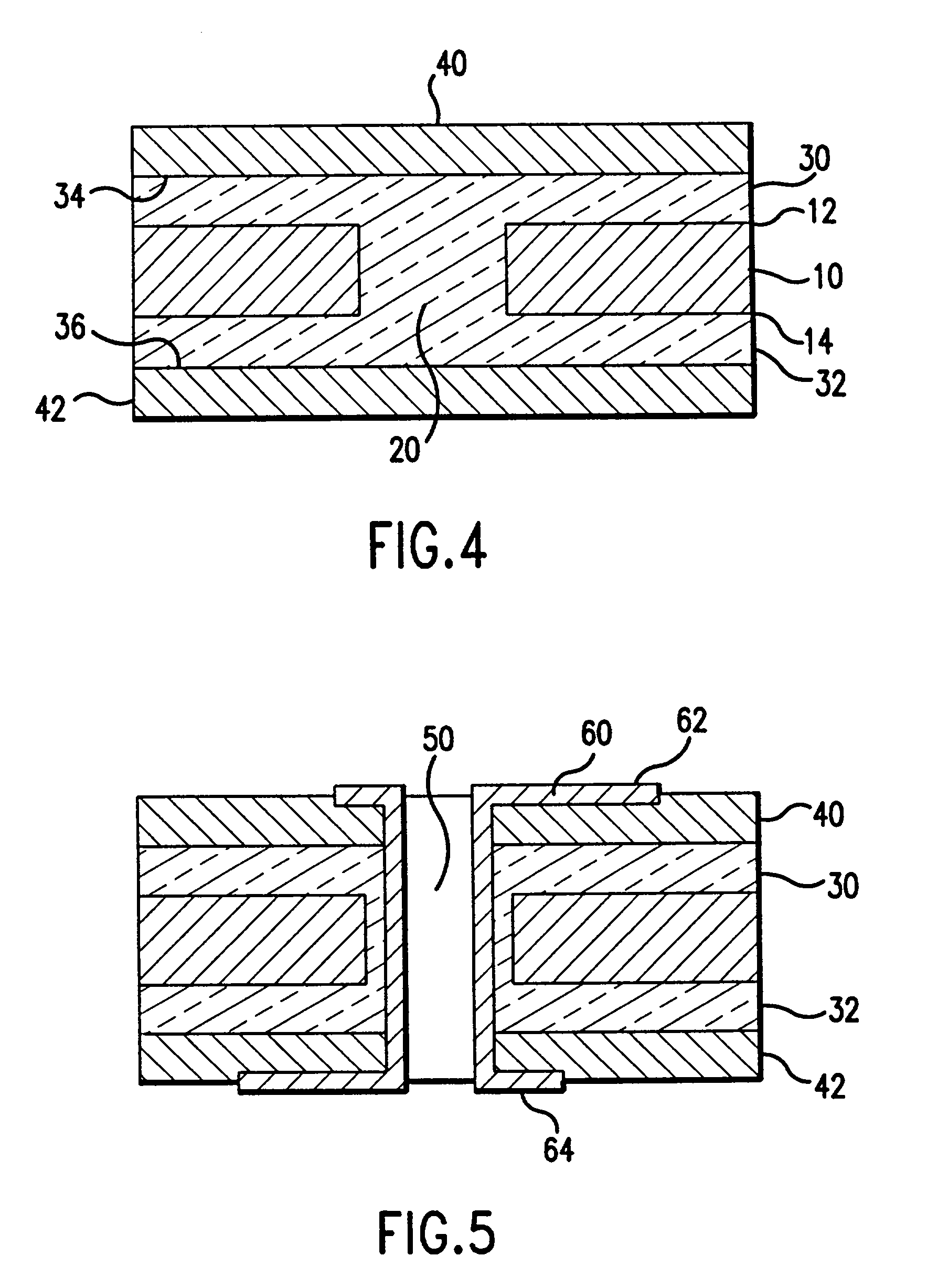 [0016]FIG. 4 is a side view of a substrate after a dielectric and metal “cap” layers have been laminated to the metal core;