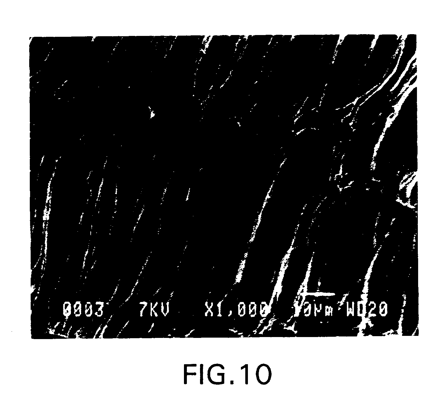 [0022]FIG. 10 is a scanning electronmicrograph of an expanded PTFE material that forms the matrix that contains the adhesive filler to form one dielectric material in the present invention;