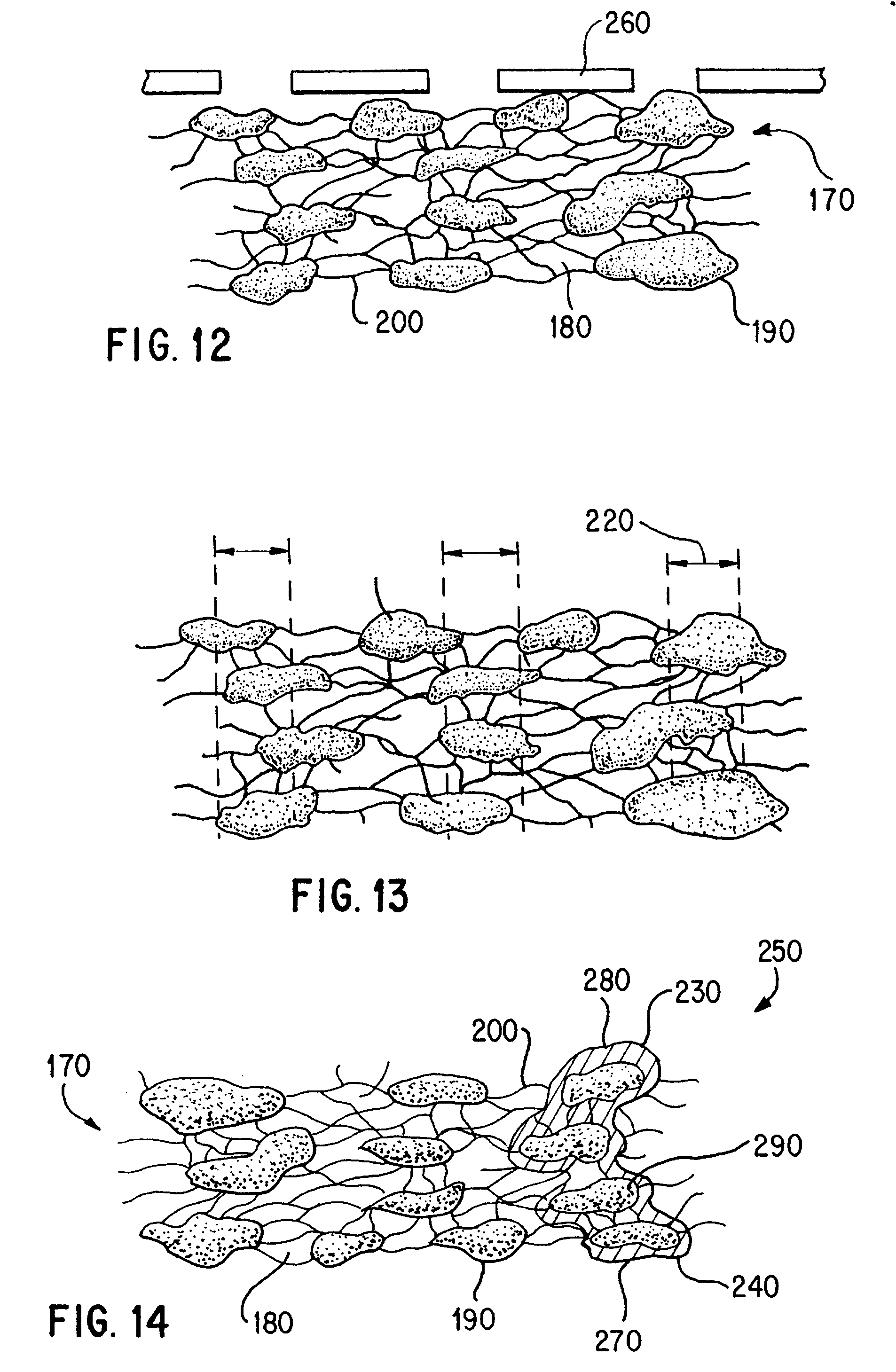 [0024] FIGS. 12-14 schematically show the formation of a conductive Z-axis material containing irregularly shaped conductive pathways;