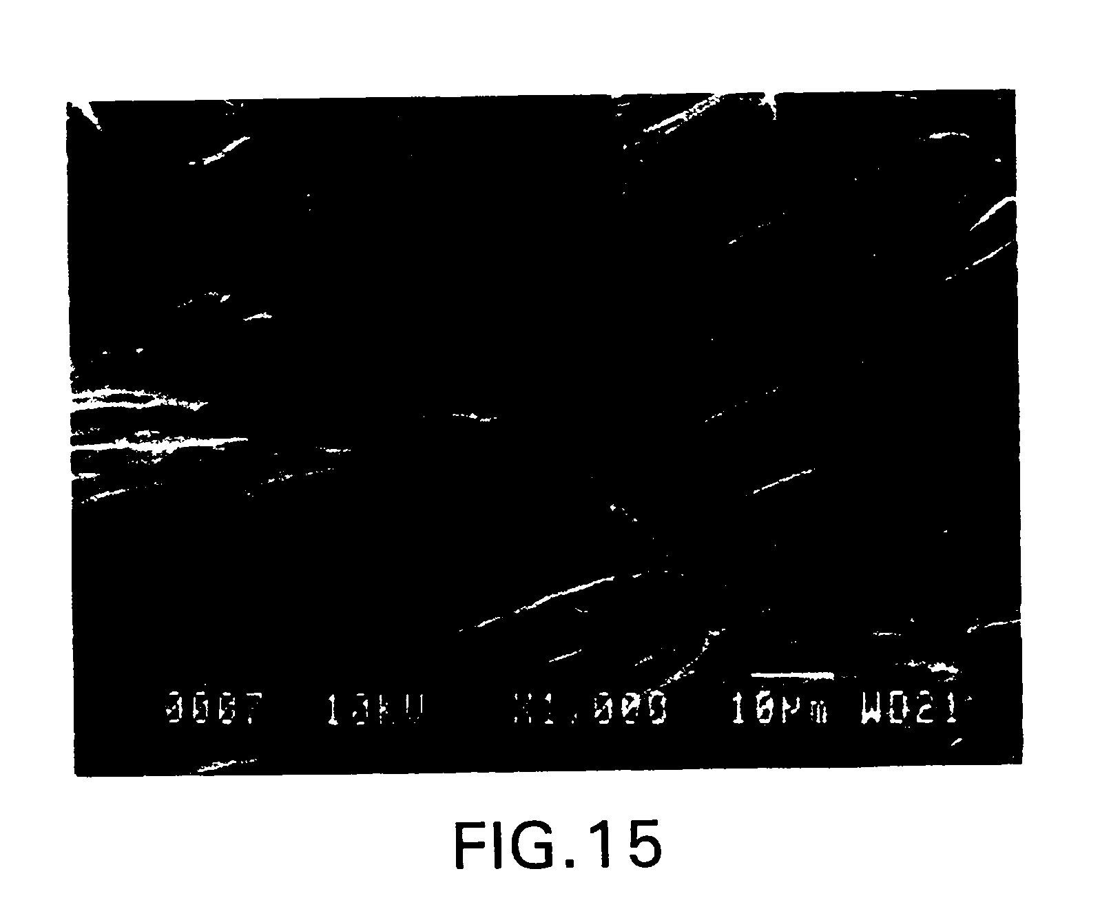 [0139] A membrane formed from a stretched porous polytetrafluoroethylene membrane having the node-fibril structure shown in FIG. 15 (1000× magnification) is 76 μm thick with a density of 0.22 gm/cm3and an air volume of 70% at 25° C., and is available from W. L. Gore & Associates, was prepared as in Example 9 to form a conductive Z-axis membrane, except that the masking strips were 2 mil pad with a 5 mil pitch.