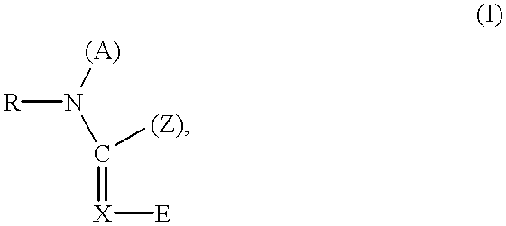 [0007] in which [0008] R represents hydrogen, optionally substituted radicals from the group consisting of acyl, alkyl, aryl, aralkyl, heteroaryl or heteroarylalkyl; [0009] A represents a monofunctional group from the series consisting of hydrogen, acyl, alkyl and aryl, or represents a bifunctional group which is linked to the radical Z; [0010] E represents an electron-attracting radical; [0011] X represents the radicals —CH═ or ═N—, it being possible for the radical —CH═ to be linked to the radical Z instead of an H atom; [0012] Z represents a monofunctional group from the series consisting of alkyl, —O-R, -S-R and