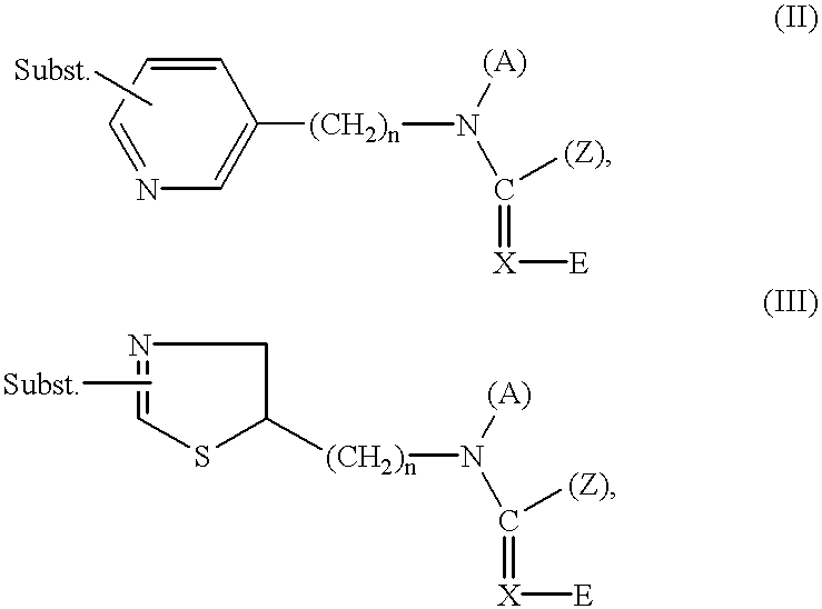 [0031] instead of X form a saturated or unsaturated heterocyclic ring. The heterocyclic ring can contain a further 1 or 2 identical or different hetero atoms and/or hetero groups. Hetero atoms are preferably oxygen, sulphur or nitrogen, and hetero groups are N-alkyl, the alkyl or N-alkyl group preferably containing 1 to 4, in particular 1 or 2, carbon atoms. Alkyl which may be mentioned is methyl, ethyl, n- and i-propyl and n-, i- and t-butyl. The heterocyclic ring contains 5 to 7, preferably 5 or 6, ring members. [0032] Examples of the heterocyclic ring which may be mentioned are pyrrolidine, piperidine, piperazine, hexamethyleneimine, morpholine and N-methylpiperazine. [0033] The compounds of the general formulae (II) and (III) may be mentioned as compounds which can be used very particularly preferably according to the invention: