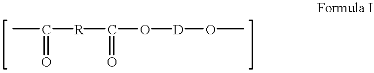 [0136] in which [0137] R represents a divalent radical of a dicarboxylic acid having a molecular weight of less than about 350, and [0138] D represents a divalent radical of an organic diol having a molecular weight of less than about 250, [0139] The long-chain ester units make up about 35-85% by weight of the copolyester and have the formula II