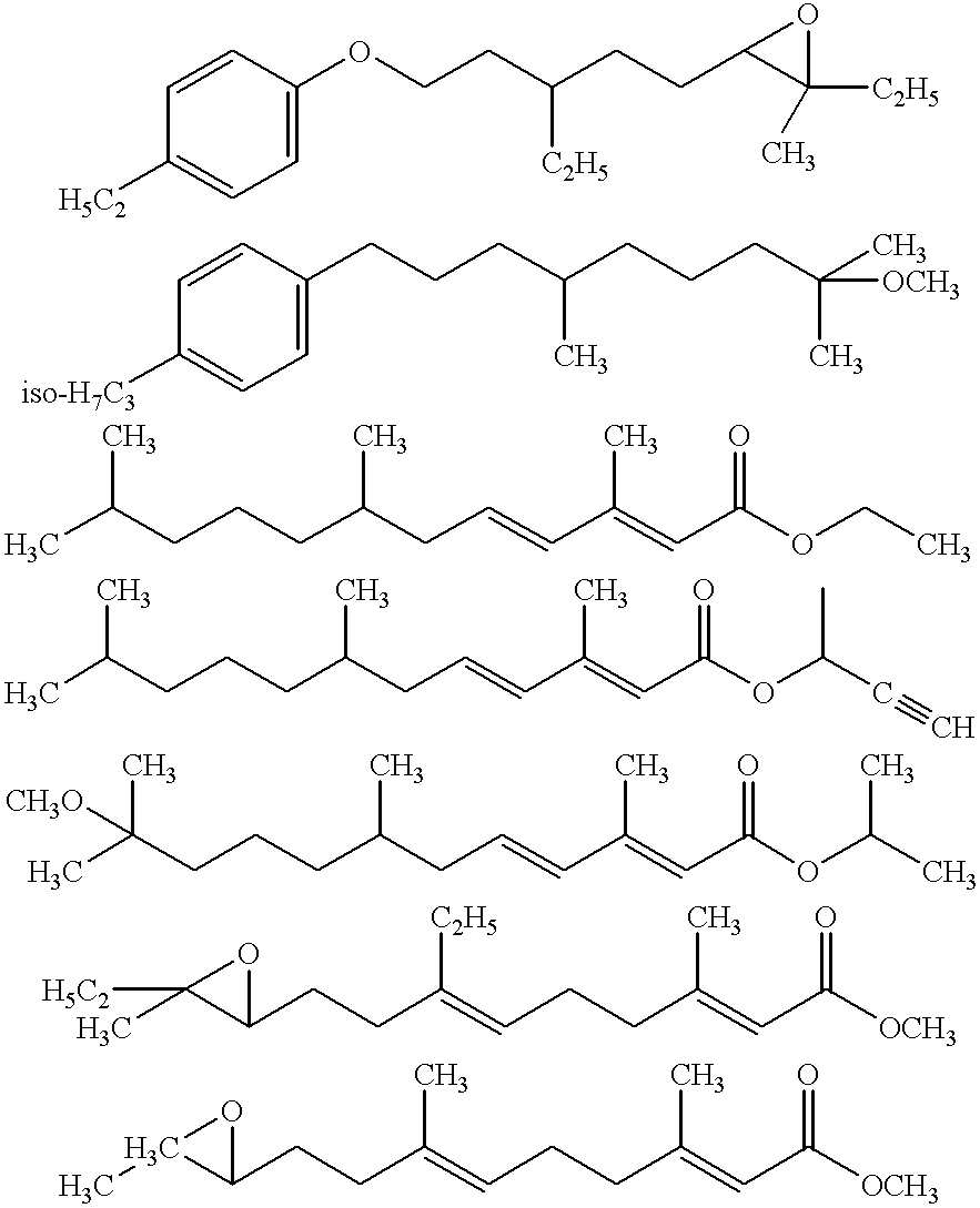 [0190] in which [0191] R1and R2represent halogen, optionally halogen-substituted alkyl or optionally halogen-substituted phenyl, [0192] R3represent hydrogen or CN, [0193] R4represents hydrogen or halogen and [0194] R5represents hydrogen or halogen, [0195] Preferred synthetic pyrethroids are those of the formula I in which [0196] R1represents halogen, in particular fluorine, chlorine or bromine, [0197] R2represents halogen, in particular, fluorine, chlorine, bromine, trihalogenomethyl, phenyl or chlorophenyl, [0198] R3represents hydrogen or CN, [0199] R4represents hydrogen or fluorine and [0200] R5represents hydrogen. [0201] Particularly preferred synthetic pyrethroids are those of the formula I in which [0202] R1represents chlorine, [0203] R2represents chlorine, trifluoromethyl or p-chlorophenyl, [0204] R3represents CN, [0205] R4represents hydrogen or fluorine and [0206] R5represents hydrogen. [0207] Compounds of the formula I which may be mentioned in particular are those in which [0208] R1represents chlorine, [0209] R2represents chlorine, or p-chlorophenyl, [0210] R3represents CN, [0211] R4represents fluorine in the 4-position and [0212] R5represents hydrogen. [0213] Compounds which may be mentioned specifically are: [0214] (α-cyano-4-fluoro-3-phenoxy)benzyl 3-[2-(4-chlorophenyl)-2-chlorovinyl]-2,2-dimethyl-cyclopropanecarboxylate (flumethrin), [0215] α-cyano (4-fluoro-3-phenoxy)-benzyl 2,2-dimethyl-3-(2,2-dichlorovinyl)-cyclo-propanecarboxylate (cyfluthrin) and its enantiomers and stereomers, [0216] α-cyano-3-phenoxybenzyl(±)-cis, trans-3-(2,2-dibromovinyl)-2,2-dimethyl-cyclopropanecarboxylate (deltamethrin), [0217] α-cyano-3-phenoxybenzyl 2,2-dimethyl-3-(2,2-dichlorovinyl)cyclopropanecarboxy-late (cypermethrin), [0218] 3-phenoxybenzyl(±)-cis, trans-3-(2,2-dichlorovinyl)-2,2-dimethyl-cyclopropanecarboxylate (permethrin), [0219] α-cyano-3-phenoxy-benzyl α-(p-Cl-phenyl)-isovalerate (fenvalerate) and [0220] 2-cyano-3-phenoxybenzyl 2-(2-chloro-α,α,α-trifluoro-p-toluidino)-3-methylbutyrate (fluvalinate). [0221] The amidines include: [0222] 3-methyl-2-[2,4-dimethyl-phenylimino]-thiazoline, [0223] 2-(4-chloro-2-methylphenylimino)-3-methylthiazolidine, [0224] 2-(4-chloro-2-methylphenylimino)-3-(isobutyl-1-enyl)-thiazolidine and [0225] 1,5-bis-(2,4-dimethylphenyl)-3-methyl-1,3,5-triazapenta-1,4-diene (amitraz). [0226] The juvenile hormones or juvenile-hormone-like substances include substituted diaryl ethers, benzoylureas and triazine derivatives. The juvenile hormones and juvenile-hormone-like substances include, in particular, compounds of the following formulae: