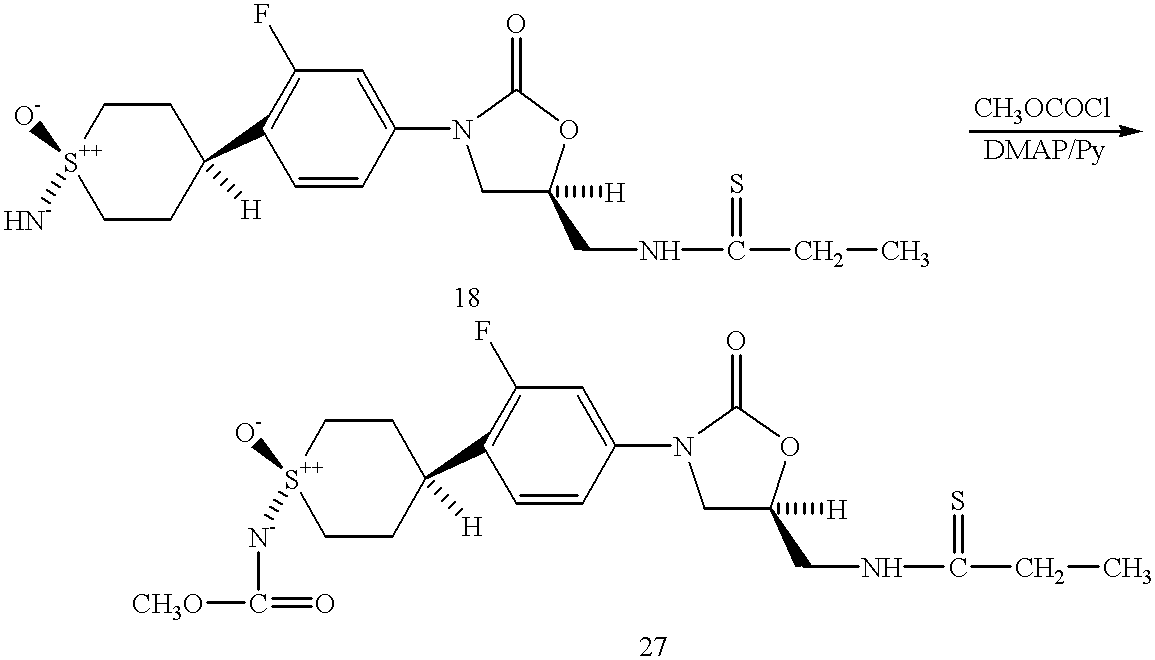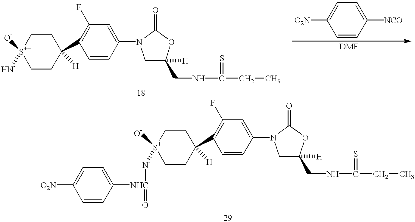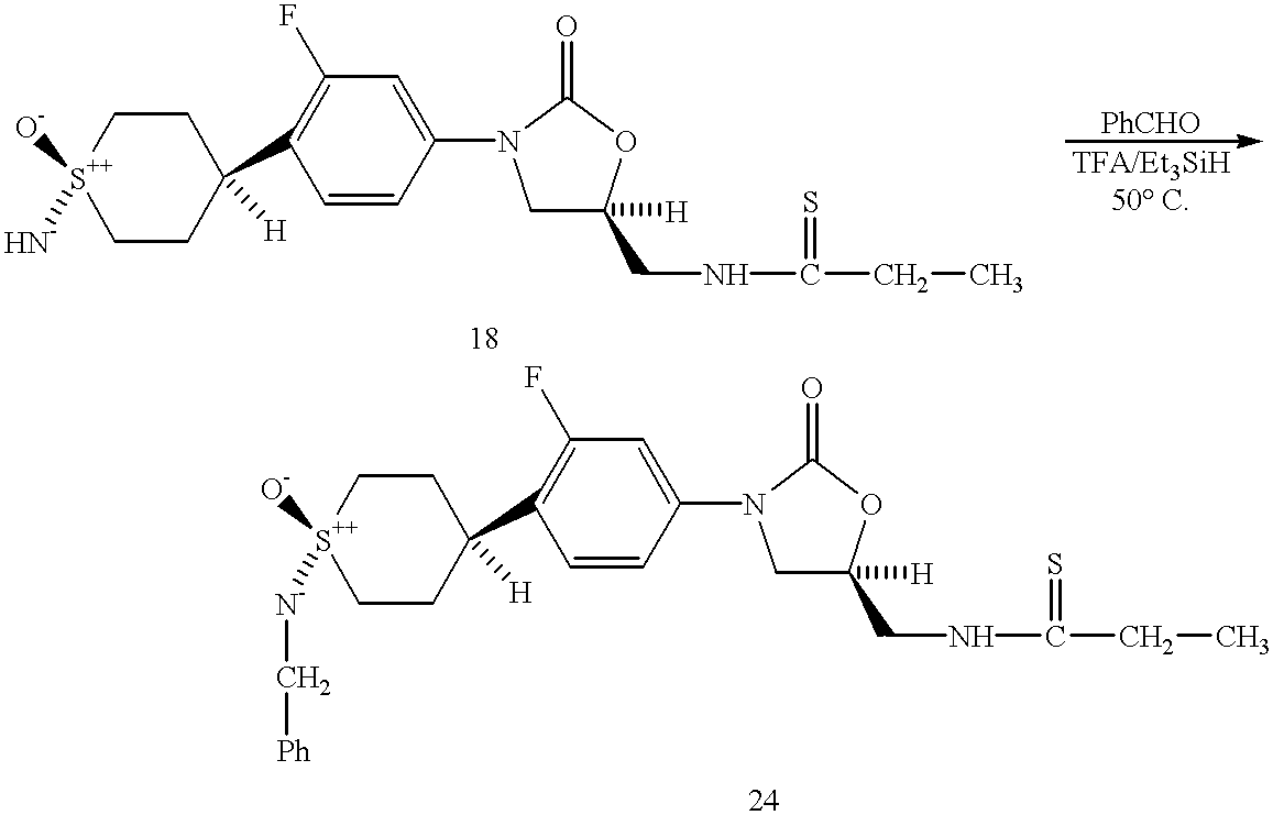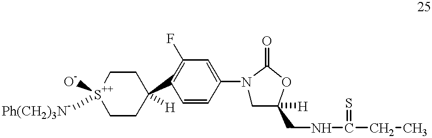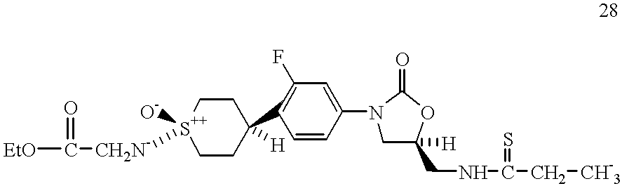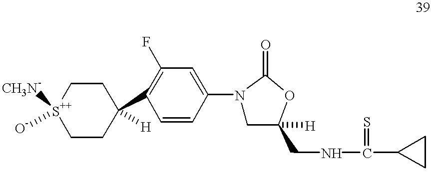 [0088] These absolute configurations are called (S)-configuration according to the Cahn-Ingold-Prelog nomenclature system. It will be appreciated by those skilled in the art that compounds of the present invention may have additional chiral centers and be isolated in optically active and racemic forms. The present invention encompasses any racemic, optically-active, tautomeric, or stereoisomeric form, or mixture thereof, of a compound of the invention. [0089] Examples of the present invention are: [0090] (1) N-({(5S)-3-[3-Fluoro-4-(1-imino-1-oxido-1λ4,4-thiazinan-4-yl)phenyl]-2-oxo-1,3-oxazolidin-5-yl}methyl)ethanethioamide; [0091] (2) N-({(5S)-3-[3-Fluoro-4-(1-imino-1-oxido-1λ4,4-thiazinan-4-yl)phenyl]-2-oxo-1,3-oxazolidin-5-yl}methyl)propanethioamide; [0092] (3) N-({(5S)-3-[3-Fluoro-4-(1-imino-1-oxido-1λ4,4-thiazinan-4-yl)phenyl]-2-oxo-1,3-oxazolidin-5-yl}methyl)cyclopropanecarbothioamide; [0093] (4) N-({(5S)-3-[3-Fluoro-4-(1-imino-1-oxidohexahydro-1λ4-thiopyran-4-yl)phenyl]-2-oxo-1,3-oxazolidin-5-yl}methyl)acetamide (E)-isomer; [0094] (5) N-({(5S)-3-[3-Fluoro-4-(1-imino-1-oxidohexahydro-1λ4-thiopyran-4-yl)phenyl]-2-oxo-1,3-oxazolidin-5-yl}methyl)ethanethioamide (E)-isomer; [0095] (6) N-({(5S)-3-[3-Fluoro-4-(1-imino-1-oxidohexahydro-1λ4-thiopyran-4-yl)phenyl]-2-oxo-1,3-oxazolidin-5-yl}methyl)propanethioamide (E)-isomer; [0096] (7) N-({(5S)-3-[3-Fluoro-4-(1-imino-1-oxidohexahydro-1λ4-thiopyran-4-yl)phenyl]-2-oxo-1,3-oxazolidin-5-yl}methyl)cyclopropanecarbothioamide (E)-isomer; [0097] (8) N-({(5S)-3-[3-Fluoro-4-(1-imino-1-oxidohexahydro-1λ4-thiopyran-4-yl)phenyl]-2-oxo-1,3-oxazolidin-5-yl}methyl)acetamide (Z)-isomer; [0098] (9) N-({(5S)-3-[3-Fluoro-4-(1-imino-1-oxidohexahydro-1λ4-thiopyran-4-yl)phenyl]-2-oxo-1,3-oxazolidin-5-yl}methyl)ethanethioamide (Z)-isomer; [0099] (10) N-({(5S)-3-[3-Fluoro-4-(1-imino-1-oxidohexahydro-1λ4-thiopyran-4-yl)phenyl]-2-oxo-1,3-oxazolidin-5-yl}methyl)propanethioamide (Z)-isomer; [0100] (11) N-({(5S)-3-[3-Fluoro-4-(1-imino-1-oxidohexahydro-1λ4-thiopyran-4-yl)phenyl]-2-oxo-1,3-oxazolidin-5-yl}methyl)cyclopropanethioamide (Z)-isomer; [0101] (12) N-({(5S)-3-[3-Fluoro-4-[1-(acetylimino)-1-oxidohexahydro-1λ4-thiopyran-4-yl]phenyl]-2-oxo-1,3-oxazolidin-5-yl}methyl)acetamide, (Z)-isomer; [0102] (13) N-({(5S)-3-[3-Fluoro-4-[1-(methylimino)-1-oxidohexahydro-1λ4-thiopyran-4-yl]phenyl]-2-oxo-1,3-oxazolidin-5-yl}methyl)propanethioamide, Z-isomer; [0103] (14) N-({(5S)-3-[3-Fluoro-4-[1-(acetylimino)-1-oxidohexahydro-1λ4-thiopyran-4-yl]phenyl]-2-oxo-1,3-oxazolidin-5-yl}methyl)propanethioamide, Z-isomer; [0104] (15) N-({(5S)-3-[3-Fluoro-4-[1-(ethylimino)-1-oxidohexahydro-1λ4-thiopyran-4-yl]phenyl]-2-oxo-1,3-oxazolidin-5-yl}methyl)propanethioamide, Z-isomer; [0105] (16) N-({(5S)-3-[3-Fluoro-4-[1-[(phenylmethyl)imino]-1-oxidohexahydro-1λ4-thiopyran-4-yl]phenyl]-2-oxo-1,3-oxazolidin-5-yl}methyl)propanethioamide, Z-isomer; [0106] (17) N-({(5S)-3-[3-Fluoro-4-[1-[(3-phenylpropyl)imino]-1-oxidohexahydro-1λ4-thiopyran-4-yl]phenyl]-2-oxo-1,3-oxazolidin-5-yl}methyl)propanethioamide, Z-isomer; [0107] (18) N-({(5S)-3-[3-Fluoro-4-(1-{[(methylamino)carbonyl]imino}-1-oxidohexahydro-1λ4-thiopyran-4-yl)phenyl]-2-oxo-1,3-oxazolidin-5-yl}methyl)propanethioamide, Z-isomer; [0108] (19) N-({(5S)-3-[3-Fluoro-4-(1-[(methoxycarbonyl)imino]-1-oxidohexahydro-1λ4-thiopyran-4-yl)phenyl]-2-oxo-1,3-oxazolidin-5-yl}methyl)propanethioamide, Z-isomer; [0109] (20) N-({(5S)-3-[3-Fluoro-4-(1-[[(ethoxycarbonyl)methyl]imino]-1-oxidohexahydro-1λ4-thiopyran-4-yl)phenyl]-2-oxo-1,3-oxazolidin-5-yl}methyl)propanethioamide, Z-isomer; [0110] (21) N-({(5S)-3-[3-Fluoro-4-(1-{[[(4-nitrophenyl)amino]carbonyl]imino}-1-oxidohexahydro-1λ4-thiopyran-4-yl)phenyl]-2-oxo-1,3-oxazolidin-5-yl}methyl)propanethioamide, Z-isomer; [0111] (22) N-({(5S)-3-[3-Fluoro-4-[1-[(aminocarbonyl)imino]-1-oxidohexahydro-1λ4-thiopyran-4-yl]phenyl]-2-oxo-1,3-oxazolidin-5-yl}methyl)propanethioamide, Z-isomer; [0112] (23) N-({(5S)-3-[3-Fluoro-4-[1-[[(aminocarbonyl)methyl]imino]-1-oxidohexahydro-1λ4-thiopyran-4-yl]phenyl]-2-oxo-1,3-oxazolidin-5-yl}methyl)propanethioamide, Z-isomer; [0113] (24) N-({(5S)-3-[3-Fluoro-4-[1-[(2-hydroxyethyl)imino]-1-oxidohexahydro-1λ4-thiopyran4-yl]phenyl]-2-oxo-1,3-oxazolidin-5-yl}methyl)propanethioamide, Z-isomer; [0114] (25) N-[((5S)-3-{3-Fluoro-4-[1-(methylimino)-1-oxido-1λ4,4-thiazinan-4-yl]phenyl}-2-oxo-1,3-oxazolidin-5-yl)methyl]propanethioamide; [0115] (26) N-[((5S)-3-{3-Fluoro-4-[1-(methylimino)-1-oxido-1λ4,4-thiazinan-4-yl]phenyl}-2-oxo-1,3-oxazolidin-5-yl)methyl]cyclopropanecarbothioamide; [0116] (27) N-[((5S)-3-{3-Fluoro-4-(1-[(methoxycarbonyl)imino]-1-oxido-1λ4,4-thiazinan-4-yl)phenyl}-2-oxo-1,3-oxazolidin-5-yl)methyl]propanethioamide; [0117] (28) N-[((5S)-3-{3-Fluoro-4-(1-[(methoxycarbonyl)imino]-1-oxido-1λ4,4-thiazinan-4-yl)phenyl}-2-oxo-1,3-oxazolidin-5-yl)methyl]cyclopropanecarbothioamide; [0118] (29) N-({(5S)-3-[3-Fluoro-4-[1-(methylimino)-1-oxidohexahydro-1λ4-thiopyran-4-yl]phenyl]-2-oxo-1,3-oxazolidin-5-yl}methyl)cyclopropanecarbothioamide, Z-isomer; [0119] (30) N-[((5S)-3-{3-Fluoro-4-[1-[(methoxycarbonyl)imino]-1-oxidohexahydro-1λ4-thiopyran-4-yl]phenyl}-2-oxo-1,3-oxazolidin-5-yl)methyl]cyclopropanecarbothioamide, Z-isomer; [0120] (31) N-[((5S)-3-{3-Fluoro-4-[1-(methylimino)-1-oxidohexahydro-1λ4-thiopyran-4-yl]phenyl}-2-oxo-1,3-oxazolidin-5-yl)methyl]cyclopropanecarbothioamide, E-isomer; [0121] (32) N-[((5S)-3-{3-Fluoro-4-[1-(methylimino)-1-oxidohexahydro-1λ4-thiopyran-4-yl]phenyl}-2-oxo-1,3-oxazolidin-5-yl)methyl]propanethioamide, E-isomer; [0122] (33) N-[((5S)-3-{3-Fluoro-4-[1-[[(phenylmethoxy)carbnonyl]imino]-1-oxidohexahydro-1λ4-thiopyran-4-yl]phenyl}-2-oxo-1,3-oxazolidin-5-yl)methyl]acetamide, Z-isomer; or [0123] (34) N-({(5S)-3-[3-Fluoro-4-(1-{[(benzylamino)carbonyl]imino}-1-oxidohexahydro-1λ4-thiopyran-4-yl)phenyl]-2-oxo-1,3-oxazolidin-5-yl}methyl)acetamide, Z-isomer. [0124] The following Schemes describe the preparation of compounds of the present invention. All 