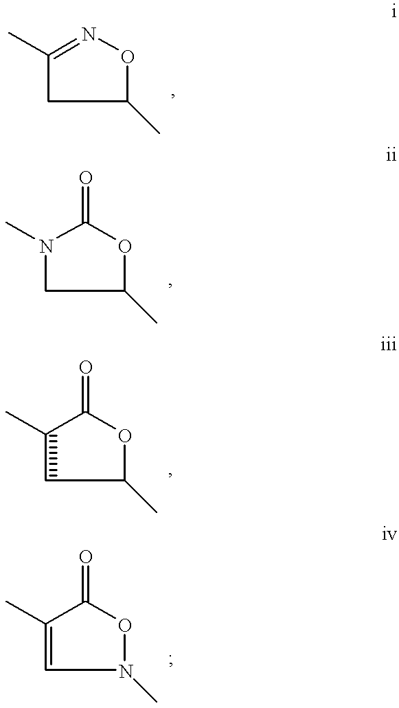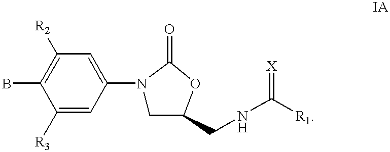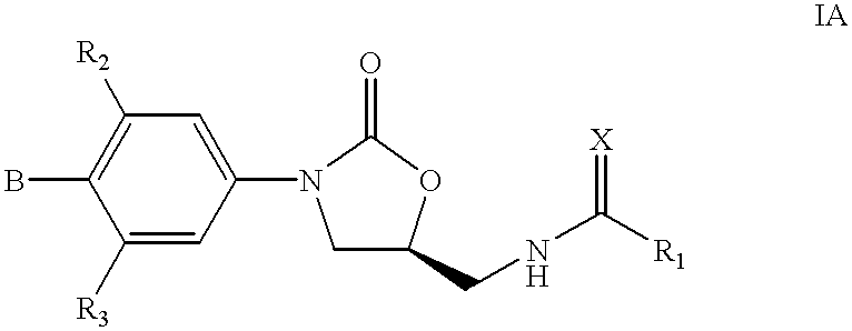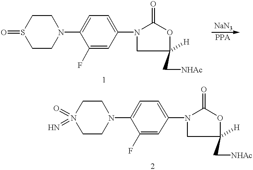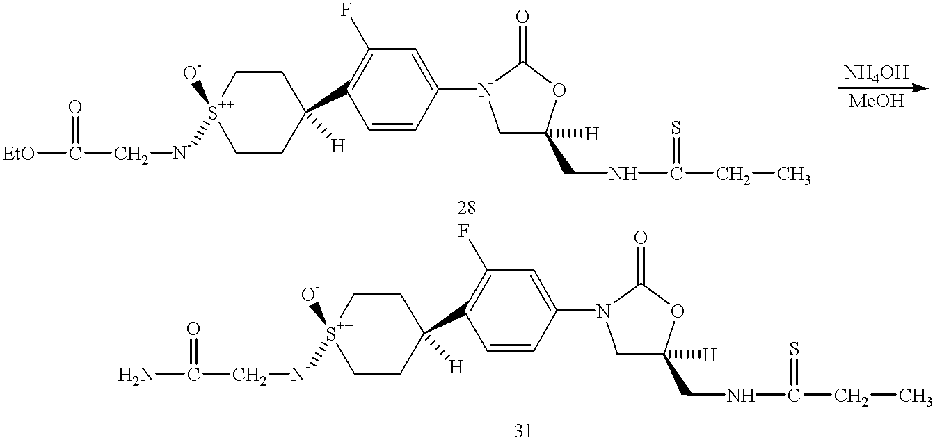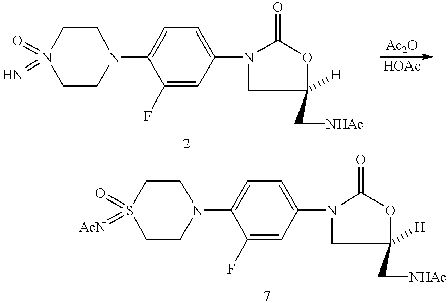 [0088] These absolute configurations are called (S)-configuration according to the Cahn-Ingold-Prelog nomenclature system. It will be appreciated by those skilled in the art that compounds of the present invention may have additional chiral centers and be isolated in optically active and racemic forms. The present invention encompasses any racemic, optically-active, tautomeric, or stereoisomeric form, or mixture thereof, of a compound of the invention. [0089] Examples of the present invention are: [0090] (1) N-({(5S)-3-[3-Fluoro-4-(1-imino-1-oxido-1λ4,4-thiazinan-4-yl)phenyl]-2-oxo-1,3-oxazolidin-5-yl}methyl)ethanethioamide; [0091] (2) N-({(5S)-3-[3-Fluoro-4-(1-imino-1-oxido-1λ4,4-thiazinan-4-yl)phenyl]-2-oxo-1,3-oxazolidin-5-yl}methyl)propanethioamide; [0092] (3) N-({(5S)-3-[3-Fluoro-4-(1-imino-1-oxido-1λ4,4-thiazinan-4-yl)phenyl]-2-oxo-1,3-oxazolidin-5-yl}methyl)cyclopropanecarbothioamide; [0093] (4) N-({(5S)-3-[3-Fluoro-4-(1-imino-1-oxidohexahydro-1λ4-thiopyran-4-yl)phenyl]-2-oxo-1,3-oxazolidin-5-yl}methyl)acetamide (E)-isomer; [0094] (5) N-({(5S)-3-[3-Fluoro-4-(1-imino-1-oxidohexahydro-1λ4-thiopyran-4-yl)phenyl]-2-oxo-1,3-oxazolidin-5-yl}methyl)ethanethioamide (E)-isomer; [0095] (6) N-({(5S)-3-[3-Fluoro-4-(1-imino-1-oxidohexahydro-1λ4-thiopyran-4-yl)phenyl]-2-oxo-1,3-oxazolidin-5-yl}methyl)propanethioamide (E)-isomer; [0096] (7) N-({(5S)-3-[3-Fluoro-4-(1-imino-1-oxidohexahydro-1λ4-thiopyran-4-yl)phenyl]-2-oxo-1,3-oxazolidin-5-yl}methyl)cyclopropanecarbothioamide (E)-isomer; [0097] (8) N-({(5S)-3-[3-Fluoro-4-(1-imino-1-oxidohexahydro-1λ4-thiopyran-4-yl)phenyl]-2-oxo-1,3-oxazolidin-5-yl}methyl)acetamide (Z)-isomer; [0098] (9) N-({(5S)-3-[3-Fluoro-4-(1-imino-1-oxidohexahydro-1λ4-thiopyran-4-yl)phenyl]-2-oxo-1,3-oxazolidin-5-yl}methyl)ethanethioamide (Z)-isomer; [0099] (10) N-({(5S)-3-[3-Fluoro-4-(1-imino-1-oxidohexahydro-1λ4-thiopyran-4-yl)phenyl]-2-oxo-1,3-oxazolidin-5-yl}methyl)propanethioamide (Z)-isomer; [0100] (11) N-({(5S)-3-[3-Fluoro-4-(1-imino-1-oxidohexahydro-1λ4-thiopyran-4-yl)phenyl]-2-oxo-1,3-oxazolidin-5-yl}methyl)cyclopropanethioamide (Z)-isomer; [0101] (12) N-({(5S)-3-[3-Fluoro-4-[1-(acetylimino)-1-oxidohexahydro-1λ4-thiopyran-4-yl]phenyl]-2-oxo-1,3-oxazolidin-5-yl}methyl)acetamide, (Z)-isomer; [0102] (13) N-({(5S)-3-[3-Fluoro-4-[1-(methylimino)-1-oxidohexahydro-1λ4-thiopyran-4-yl]phenyl]-2-oxo-1,3-oxazolidin-5-yl}methyl)propanethioamide, Z-isomer; [0103] (14) N-({(5S)-3-[3-Fluoro-4-[1-(acetylimino)-1-oxidohexahydro-1λ4-thiopyran-4-yl]phenyl]-2-oxo-1,3-oxazolidin-5-yl}methyl)propanethioamide, Z-isomer; [0104] (15) N-({(5S)-3-[3-Fluoro-4-[1-(ethylimino)-1-oxidohexahydro-1λ4-thiopyran-4-yl]phenyl]-2-oxo-1,3-oxazolidin-5-yl}methyl)propanethioamide, Z-isomer; [0105] (16) N-({(5S)-3-[3-Fluoro-4-[1-[(phenylmethyl)imino]-1-oxidohexahydro-1λ4-thiopyran-4-yl]phenyl]-2-oxo-1,3-oxazolidin-5-yl}methyl)propanethioamide, Z-isomer; [0106] (17) N-({(5S)-3-[3-Fluoro-4-[1-[(3-phenylpropyl)imino]-1-oxidohexahydro-1λ4-thiopyran-4-yl]phenyl]-2-oxo-1,3-oxazolidin-5-yl}methyl)propanethioamide, Z-isomer; [0107] (18) N-({(5S)-3-[3-Fluoro-4-(1-{[(methylamino)carbonyl]imino}-1-oxidohexahydro-1λ4-thiopyran-4-yl)phenyl]-2-oxo-1,3-oxazolidin-5-yl}methyl)propanethioamide, Z-isomer; [0108] (19) N-({(5S)-3-[3-Fluoro-4-(1-[(methoxycarbonyl)imino]-1-oxidohexahydro-1λ4-thiopyran-4-yl)phenyl]-2-oxo-1,3-oxazolidin-5-yl}methyl)propanethioamide, Z-isomer; [0109] (20) N-({(5S)-3-[3-Fluoro-4-(1-[[(ethoxycarbonyl)methyl]imino]-1-oxidohexahydro-1λ4-thiopyran-4-yl)phenyl]-2-oxo-1,3-oxazolidin-5-yl}methyl)propanethioamide, Z-isomer; [0110] (21) N-({(5S)-3-[3-Fluoro-4-(1-{[[(4-nitrophenyl)amino]carbonyl]imino}-1-oxidohexahydro-1λ4-thiopyran-4-yl)phenyl]-2-oxo-1,3-oxazolidin-5-yl}methyl)propanethioamide, Z-isomer; [0111] (22) N-({(5S)-3-[3-Fluoro-4-[1-[(aminocarbonyl)imino]-1-oxidohexahydro-1λ4-thiopyran-4-yl]phenyl]-2-oxo-1,3-oxazolidin-5-yl}methyl)propanethioamide, Z-isomer; [0112] (23) N-({(5S)-3-[3-Fluoro-4-[1-[[(aminocarbonyl)methyl]imino]-1-oxidohexahydro-1λ4-thiopyran-4-yl]phenyl]-2-oxo-1,3-oxazolidin-5-yl}methyl)propanethioamide, Z-isomer; [0113] (24) N-({(5S)-3-[3-Fluoro-4-[1-[(2-hydroxyethyl)imino]-1-oxidohexahydro-1λ4-thiopyran4-yl]phenyl]-2-oxo-1,3-oxazolidin-5-yl}methyl)propanethioamide, Z-isomer; [0114] (25) N-[((5S)-3-{3-Fluoro-4-[1-(methylimino)-1-oxido-1λ4,4-thiazinan-4-yl]phenyl}-2-oxo-1,3-oxazolidin-5-yl)methyl]propanethioamide; [0115] (26) N-[((5S)-3-{3-Fluoro-4-[1-(methylimino)-1-oxido-1λ4,4-thiazinan-4-yl]phenyl}-2-oxo-1,3-oxazolidin-5-yl)methyl]cyclopropanecarbothioamide; [0116] (27) N-[((5S)-3-{3-Fluoro-4-(1-[(methoxycarbonyl)imino]-1-oxido-1λ4,4-thiazinan-4-yl)phenyl}-2-oxo-1,3-oxazolidin-5-yl)methyl]propanethioamide; [0117] (28) N-[((5S)-3-{3-Fluoro-4-(1-[(methoxycarbonyl)imino]-1-oxido-1λ4,4-thiazinan-4-yl)phenyl}-2-oxo-1,3-oxazolidin-5-yl)methyl]cyclopropanecarbothioamide; [0118] (29) N-({(5S)-3-[3-Fluoro-4-[1-(methylimino)-1-oxidohexahydro-1λ4-thiopyran-4-yl]phenyl]-2-oxo-1,3-oxazolidin-5-yl}methyl)cyclopropanecarbothioamide, Z-isomer; [0119] (30) N-[((5S)-3-{3-Fluoro-4-[1-[(methoxycarbonyl)imino]-1-oxidohexahydro-1λ4-thiopyran-4-yl]phenyl}-2-oxo-1,3-oxazolidin-5-yl)methyl]cyclopropanecarbothioamide, Z-isomer; [0120] (31) N-[((5S)-3-{3-Fluoro-4-[1-(methylimino)-1-oxidohexahydro-1λ4-thiopyran-4-yl]phenyl}-2-oxo-1,3-oxazolidin-5-yl)methyl]cyclopropanecarbothioamide, E-isomer; [0121] (32) N-[((5S)-3-{3-Fluoro-4-[1-(methylimino)-1-oxidohexahydro-1λ4-thiopyran-4-yl]phenyl}-2-oxo-1,3-oxazolidin-5-yl)methyl]propanethioamide, E-isomer; [0122] (33) N-[((5S)-3-{3-Fluoro-4-[1-[[(phenylmethoxy)carbnonyl]imino]-1-oxidohexahydro-1λ4-thiopyran-4-yl]phenyl}-2-oxo-1,3-oxazolidin-5-yl)methyl]acetamide, Z-isomer; or [0123] (34) N-({(5S)-3-[3-Fluoro-4-(1-{[(benzylamino)carbonyl]imino}-1-oxidohexahydro-1λ4-thiopyran-4-yl)phenyl]-2-oxo-1,3-oxazolidin-5-yl}methyl)acetamide, Z-isomer. [0124] The following Schemes describe the preparation of compounds of the present invention. All 