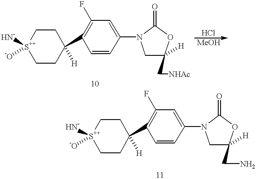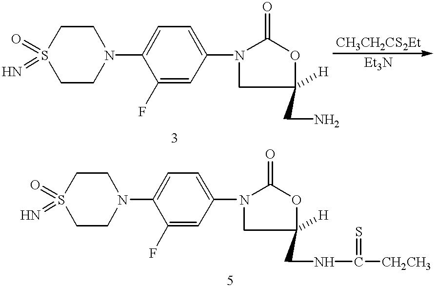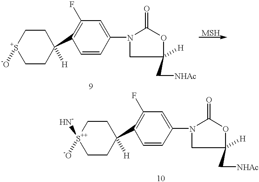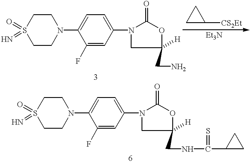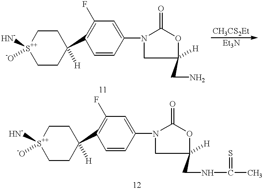 [0147] A stirred solution of 3 (371 mg, 1.08 mmol) in MeOH (10 ml) is treated with triethylamine (302 μL, 2.17 mmol) and ethyl dithioacetate (162 μL, 1.41 mmol) and warmed at 40° C., under nitrogen, for 17 hours. The solid product is chromatographed on silica gel with 2% MeOH—CH2Cl2and the resulting product is crystallized from EtOH—CH3CN to give 298 mg of 4. [0148] mp 197-198° C.; HRMS (FAB) calcd for C16H22FN4O3S2(M+H+) 401.1117, found 401.1115. Anal. Calcd for C16H21FN4O3S2: C, 47.98; H, 5.28; N, 13.99. Found: C, 47.98; H, 5.34; N, 14.01. [0149] [0150] As described in Example 1, Step 2 the reaction of 3 with ethyl dithiopropionate and triethylamine in methanol gave 5 which is crystallized from MeOH. [0151] mp 189-190° C.; HRMS (FAB) calcd for C17H24FN4O3S2(M+H+) 415.1273, found 415.1278. Anal calcd for C17H23FN4O3S2: C, 49.26; H, 5.59; N, 13.52. Found: C, 49.89; H, 5.81; N, 13.18. [0152] [0153] As described in Example 1, Step 2 the reaction of 3 with ethyl dithiocyclopropane-carboxylate and triethylamine in MeOH gave 6 which is crystallized from MeOH. [0154] mp 209-210° C. (dec); HRMS (FAB) calcd for C18H24FN4O3S2(M+H+) 427.1273, found 427.1289. Anal. Calcd for C18H23FN4O3S2: C, 50.69; H, 5.43; N, 13.14. Found: C, 50.70; H, 5.50; N, 13.00. [0155] [0156] Step 1: [0157] A stirred, ice cold solution of ethyl O-(mesitylenesulfonyl)acetohydroxamate (1.28 g, 4.49 mmol) in dioxane (3 ml), under nitrogen, is treated dropwise during 5 minutes with 70% perchloric acid (0.48 ml, 5.57 mmol) and kept in the ice bath for 4 hours. It is then poured with stirring into ice water (30 ml), stirred for 30 minutes at 0° C. and filtered. The solid is ished with cold water and dissolved in a small amount of diethyl ether. The solution is ished with water, dried (K2CO3) and the product (O-mesitylenesulfonyl-hydroxylamine, MSH) is crystallized, under nitrogen from cold Et2O-pentane. A CH2Cl2solution of this product is used in Step 2. [0158] Step 2: [0159] A stirred solution of 9 ((S)-trans-(−)-N-[[3-[3-fluoro-4-(tetrahydro-1-oxido-2H-thiopyran-4-yl)phenyl]-2-oxo-5-oxazolidinyl]methyl]acetamide (prepared according to the procedure described in WO95/07271, Example 9, Step 1) (470 mg, 1.28 mmol) in CH2Cl2(5 ml) is treated with a CH2Cl2solution of the MSH prepared in Step 1 and kept at ambient temperature (24° C.) for 19 hours. It is mixed with water and 5% MeOH—CH2Cl2, treated with 1 N NaOH to pH 11 and extracted with 5% MeOH—CH2Cl2. The extract is dried (Na2SO4) and concentrated. Chromatography of the residue on silica gel with 2.5% MeOH-0.1% NH4OH—CH2Cl2gives 10 which can be crystallized from MeOH: [0160] Mp 225-226° C.; HRMS (FAB) calcd for C17H23FN3O4S (M+H+) 384.1393, found 384.1398. Anal calcd for C17H22FN3O4S: C, 53.25; H, 5.78; N, 10.96. Found: C, 53.18; H, 5.90; N, 10.79. [0161] Step 1