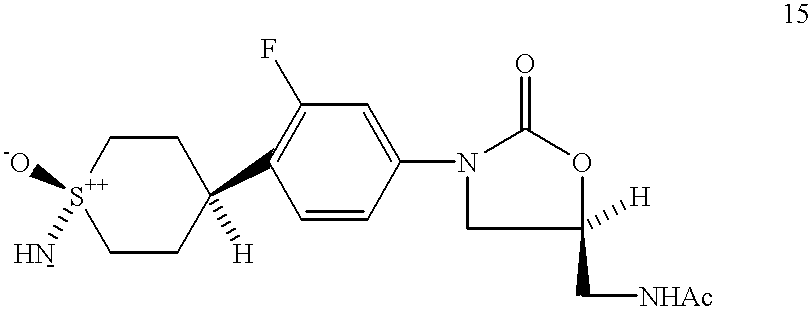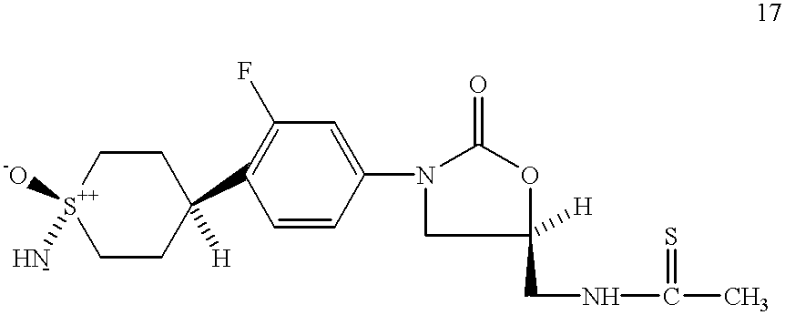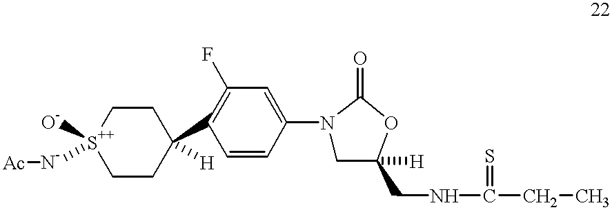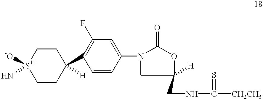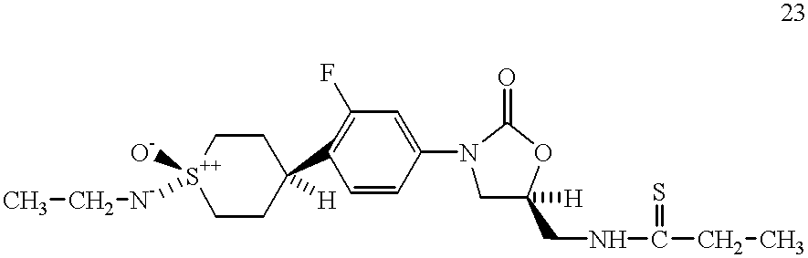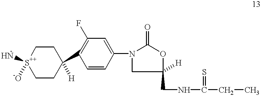 [0164] A stirred solution of 11 (159 mg, 0.47 mmol) in MeOH (5 ml) is treated with ethyl dithioacetate (73 μL, 0.64 mmol) and triethylamine (130 μL, 0.93 mmol), kept at about 40° C. for 24 hours, cooled and concentrated under a stream of nitrogen. Chromatography of the residue on silica gel first with 2% MeOH-0.1% Et3N—CHCl3, and then with 4% EtOH-0.1% Et3N—CHCl3and crystallization of the product from acetone give 94 mg of the title compound 12. [0165] Mp 193-194° C. (dec); HRMS (FAB) calcd for C17H23FN3O3S2(M+H+) 400.1165, found 400.1157. Anal calcd for C17H22FN3O3S2: C, 51.11; H, 5.55; N, 10.52. Found: C, 51.07; H, 5.61; N, 10.37. [0166] N-({(5S)-3-[3-Fluoro-4-(1-imino-1-oxidohexahydro-1λ4-thiopyran-4-yl)phenyl]-2-oxo-1,3-oxazolidin-5-yl}methyl)propanethioamide, E-Isomer (13)