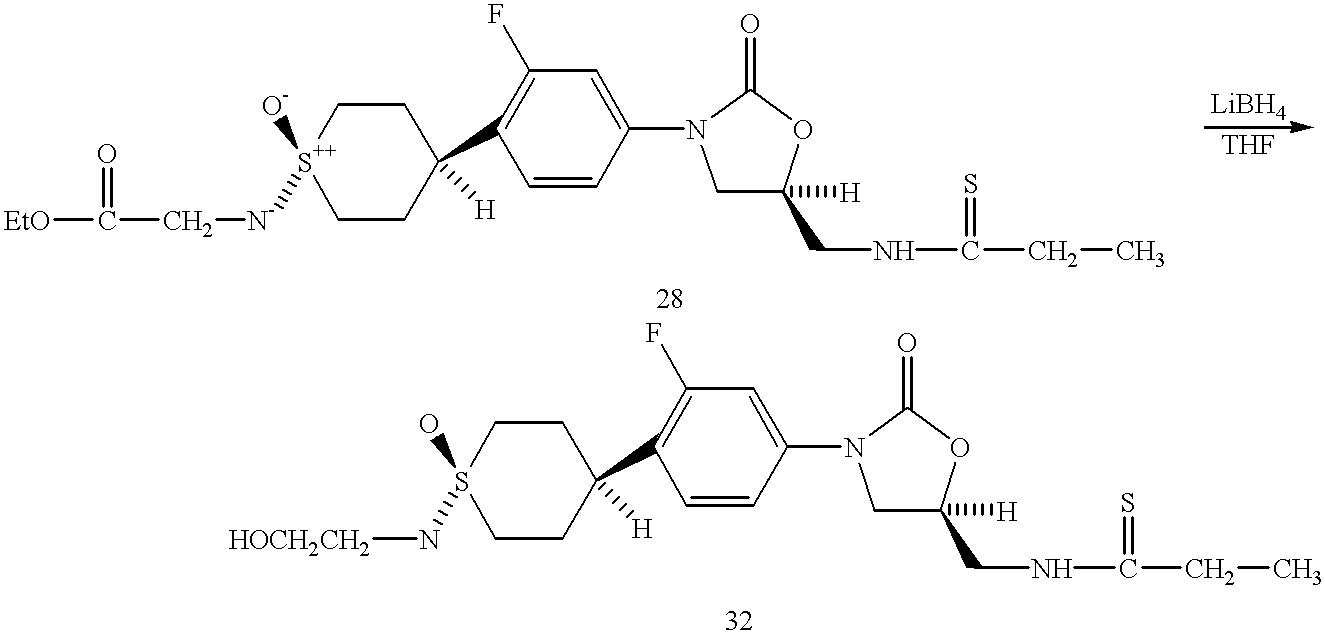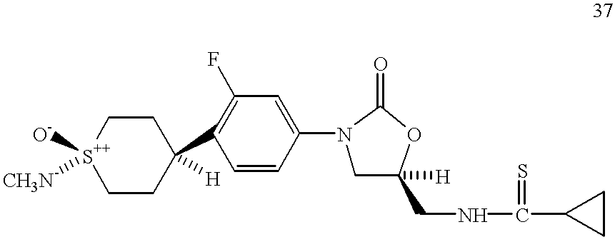 [0221] A stirred solution of 28 (Example 20) (240 mg, 0.48 mmol) in THF (5 mL) is treated with a 2.0 M solution of lithium borohydride in THF (0.24 mL, 0.48 mmol) and kept, under nitrogen, at ambient temperature for 4 hours. It is then mixed with a little water, treated, dropwise with enough 10% aqueous NaHSO4to give pH 2, stirred for 5 minutes and poured into saturated aqueous NaHCO3. The pH is raised to 10 with 1 N NaOH and the mixture is extracted with 5% MeOH—CH2Cl2. The extract is dried (NaSO4) and concentrated. Chromatography of the residue on silica gel with 5% MeOH—CH2Cl2and crystallization of the product from MeOH gives 73 mg of 32. [0222] Mp 180-181° C. (dec); HRMS(FAB) calcd for C20H29FN3O4S2(M+H+) 458.1583, found 458.1580. Anal. calcd for C20H28FN3O4S2: C, 52.50; H, 6.17; N, 9.18. Found: C, 52.64; H, 6.34, N, 8.98. [0223] [0224] Compound 33 is prepared by the procedure described in Example 13 by substituting compound 5 (Example 2) for compound 18. It is purified by silica gel chromatography first with 20% acetone-1% MeOH—CHCl3and then with 4% MeOH—CHCl3. HRMS(FAB) calcd for C18H26FN4O3S2(M+H+) 429.1430, found 429.1436. [0225] [0226] Compound 34 is prepared by the procedure described in Example 13 by substituting compound 6 (Example 3) for compound 18. It is purified by silica gel chromatography with 3% MeOH—CH2Cl2. [0227] HRMS(FAB) calcd for C19H26FN4O3S2(M+H+) 441.1430, found 441.1425. Anal. calcd for C19H25FN4O3S2: C, 51.80, H, 5.72; N, 12.72. Found: C, 51.60; H, 6.03; N, 12.34. [0228] [0229] Compound 35 is prepared by the procedure described in Example 19 by substituting compound 5 (Example 2) for compound 18. It is purified by silica gel chromatography with 3% MeOH—CHCl3and crystallization from acetonitrile-MeOH. [0230] Mp 211-212° C. (dec); HRMS(FAB) calcd for C19H26FN4O5S2(M+H+) 473.1328, found 473.1329. Anal. calcd for C19H25FN4O5S2: C, 48.29; H, 5.33; N, 11.86. Found: C, 48.34; H, 5.41; N, 11.87. [0231] [0232] Compound 36 is prepared by the procedure described in Example 19 by substituting compound 6 (Example 3) for compound 18. It is purified by silica gel chromatography first with 2.5% MeOH—CHCl3and then with 10% acetone-CHCl3and crystallization from acetonitrile-MeOH. [0233] Mp 208-209° C. (dec). Anal. calcd for C20H25FN4O5S2; C, 49.57; H, 5.20; N, 11.56. Found: C, 49.55; H, 5.22; N, 11.58. [0234] N-({(5S)-3-[3-Fluoro-4-[1-(methylimino)-1-oxidohexahydro-1λ4-thiopyran-4-yl]phenyl]-2-oxo-1,3-oxazolidin-5-yl}methyl)cyclopropanecarbothioamide, Z-isomer (37)