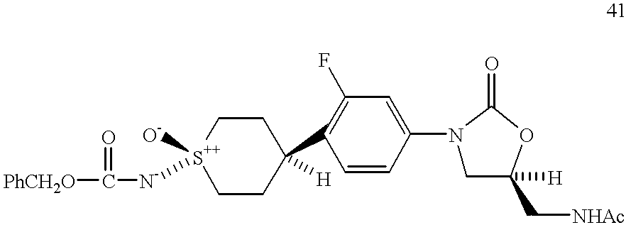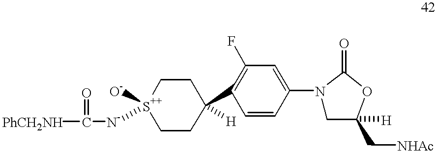 N-({(5S)-3-[3-Fluoro-4-(1-{[(benzylamino)carbonyl]imino}-1-oxidohexahydro-1λ4-thiopyran-4-yl)phenyl]-2-oxo-1,3-oxazolidin-5-yl}methyl)acetamide, Z-isomer (42)