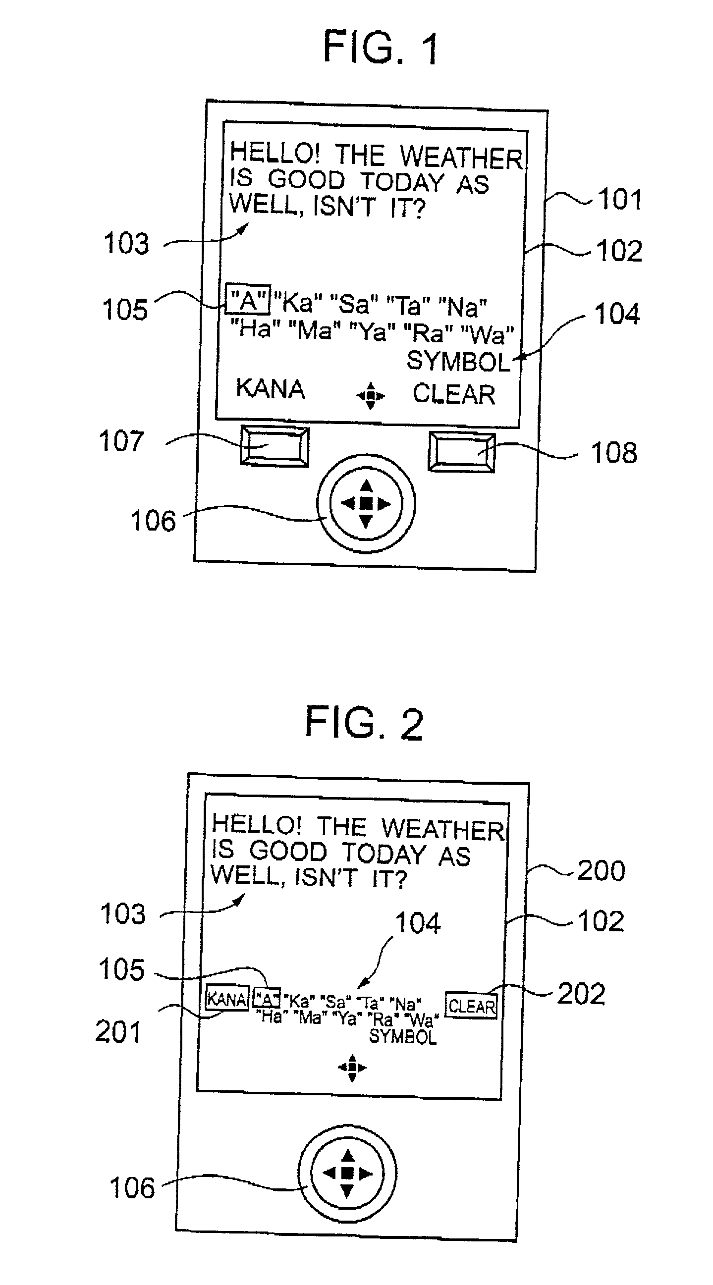 [0102] According to the embodiment 2 described above, character input can be carried out using a software key on a screen. Hardware such as telephone push-buttons are therefore no longer necessary, and the device can therefore be made smaller and lighter in weight accordingly. The required keys can therefore be displayed in a manner which is easy to see even with a small display by adopting a hierarchical structure where rows are designated in a first layout and characters within the rows are then designated in a second layout, rather than simultaneously displaying all of the kana keys. Further, the character key is arranged in a matrix shape with the home position (initial position) of the cursor being in the vicinity of the center of the matrix. Movement to a certain character key can therefore be concluded with little cursor movement when that character key is near the home position and differences in operating a character key to be designated are relatively small when a certain character key which is further away is to be designated.
