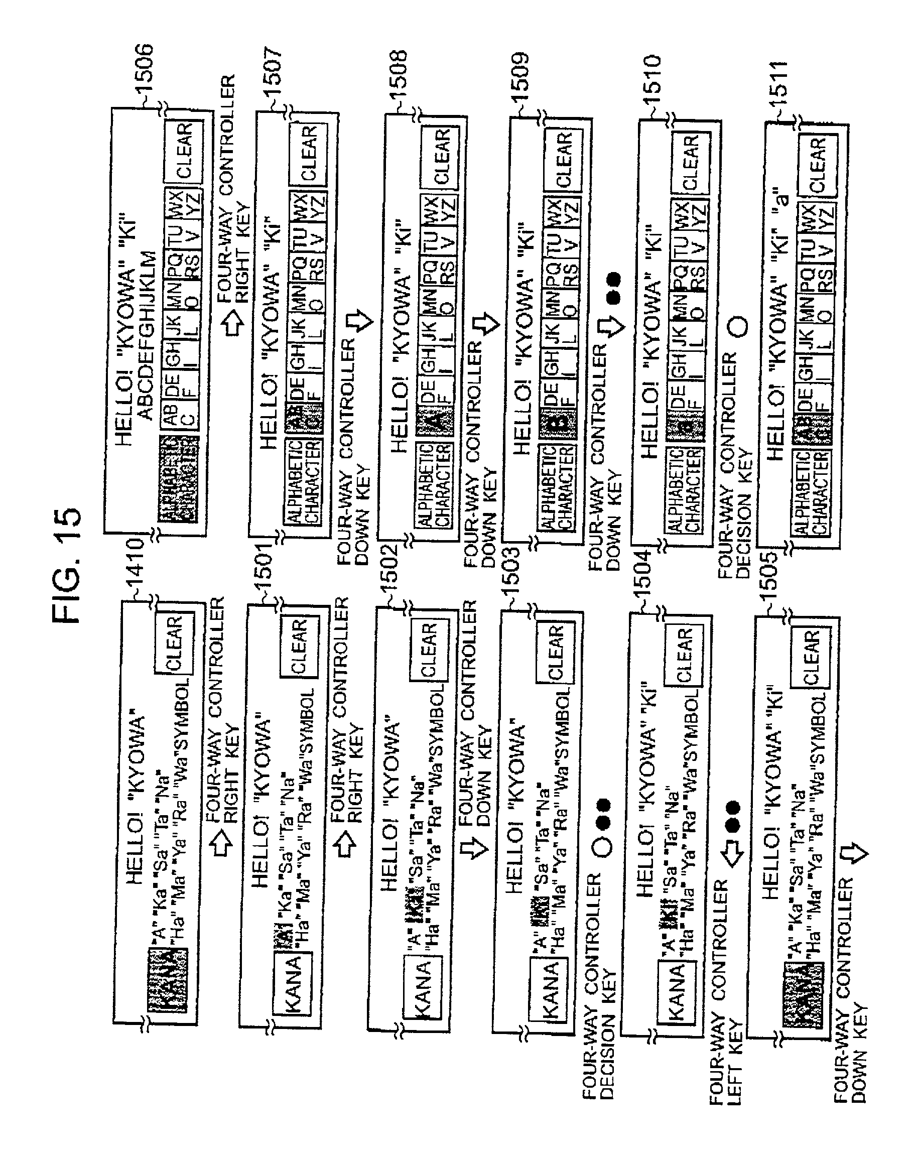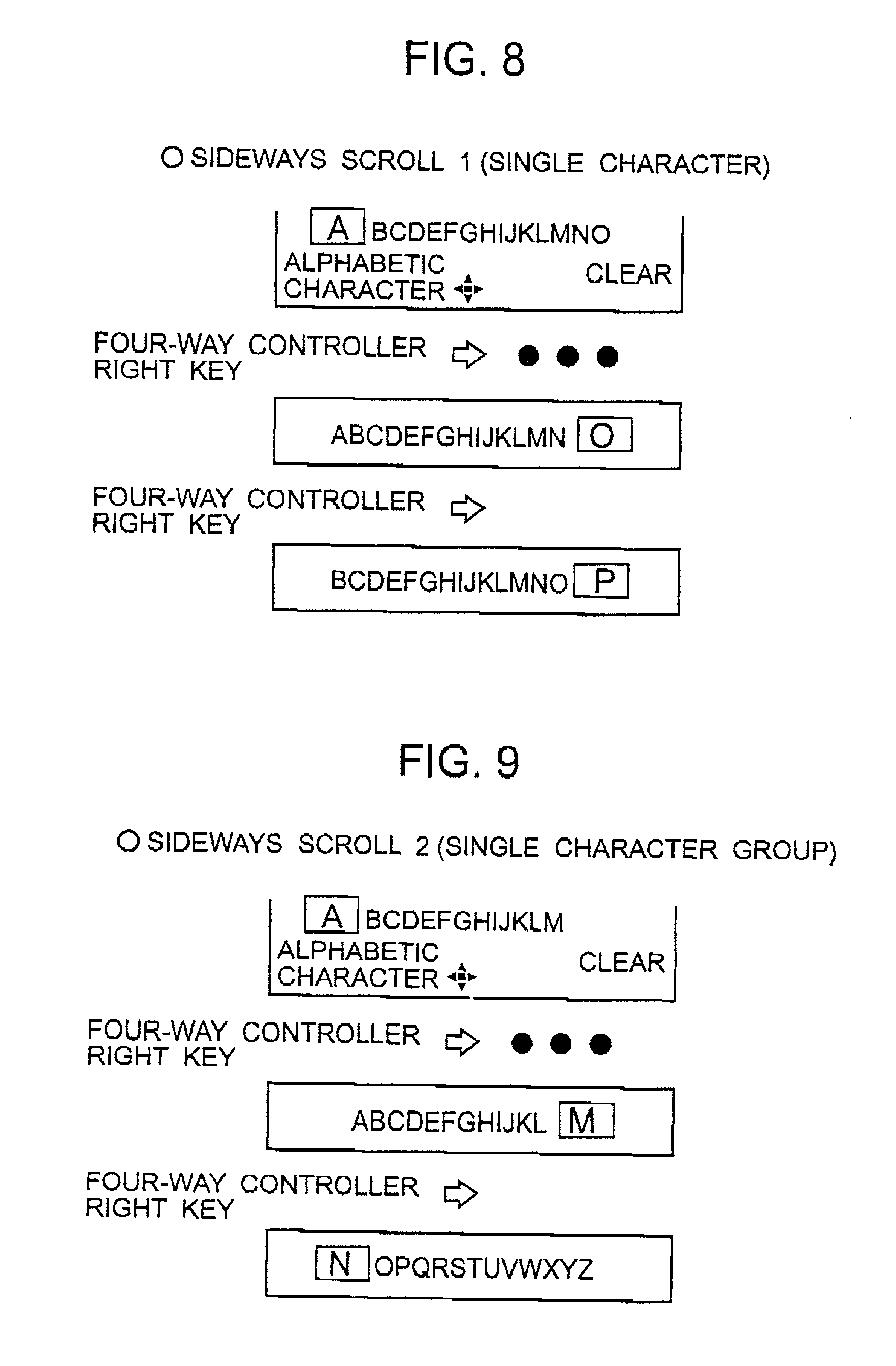 [0132] Also, since according to the fourth aspect of the invention, in addition to the character input method of the third aspect of the present invention, there are further included an alphabetic character display step for switching between upper case and lower case characters in response to a direction indication input in the second direction indication input step to display a plurality of alphabetic characters at once, and an alphabetic character selection step for causing movement to a selected position in response to a direction indication input in the first direction indication input step, and selecting one among the alphabetic characters displayed in the alphabetic character display step, the device can be miniaturized and character input is straightforward.