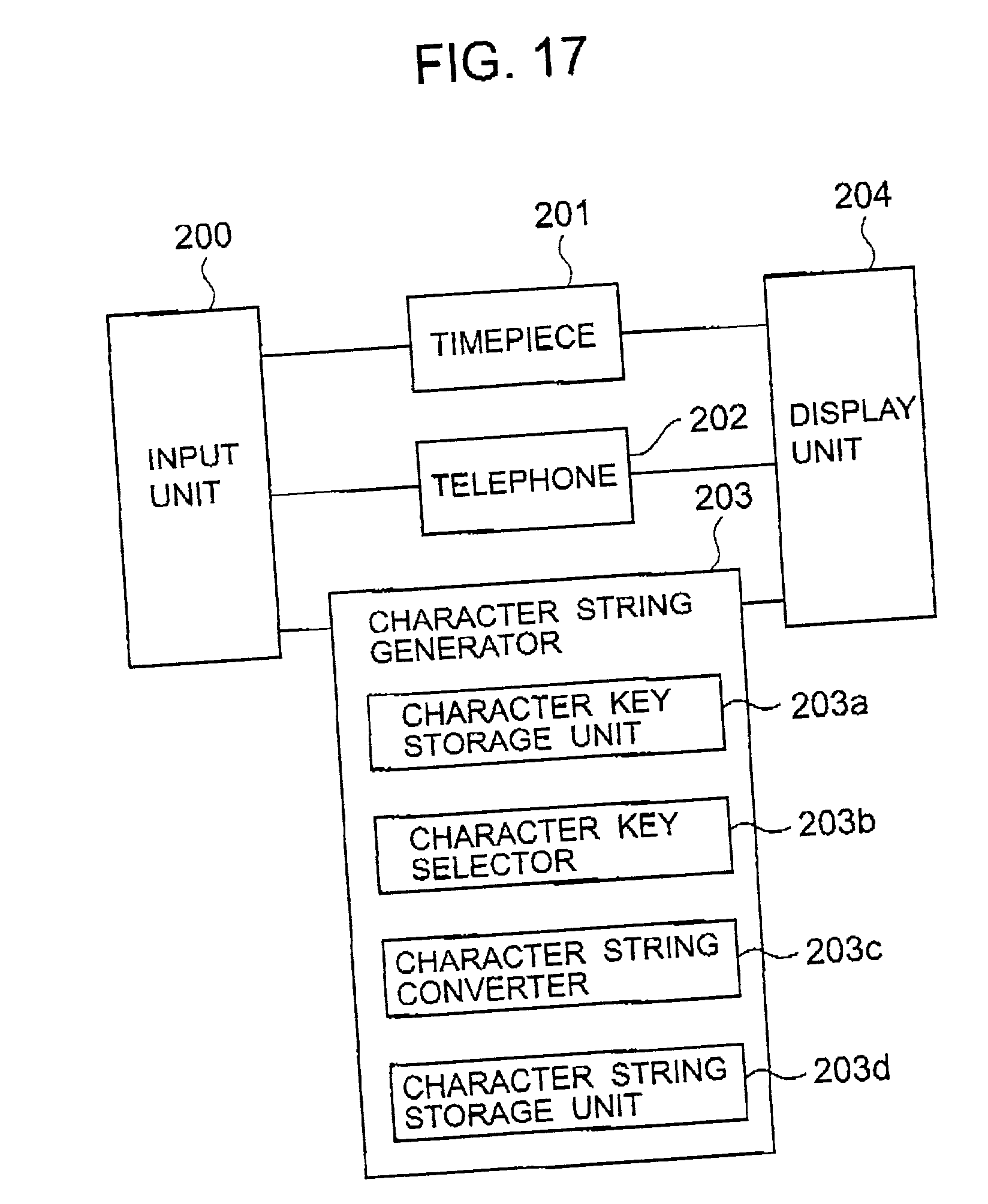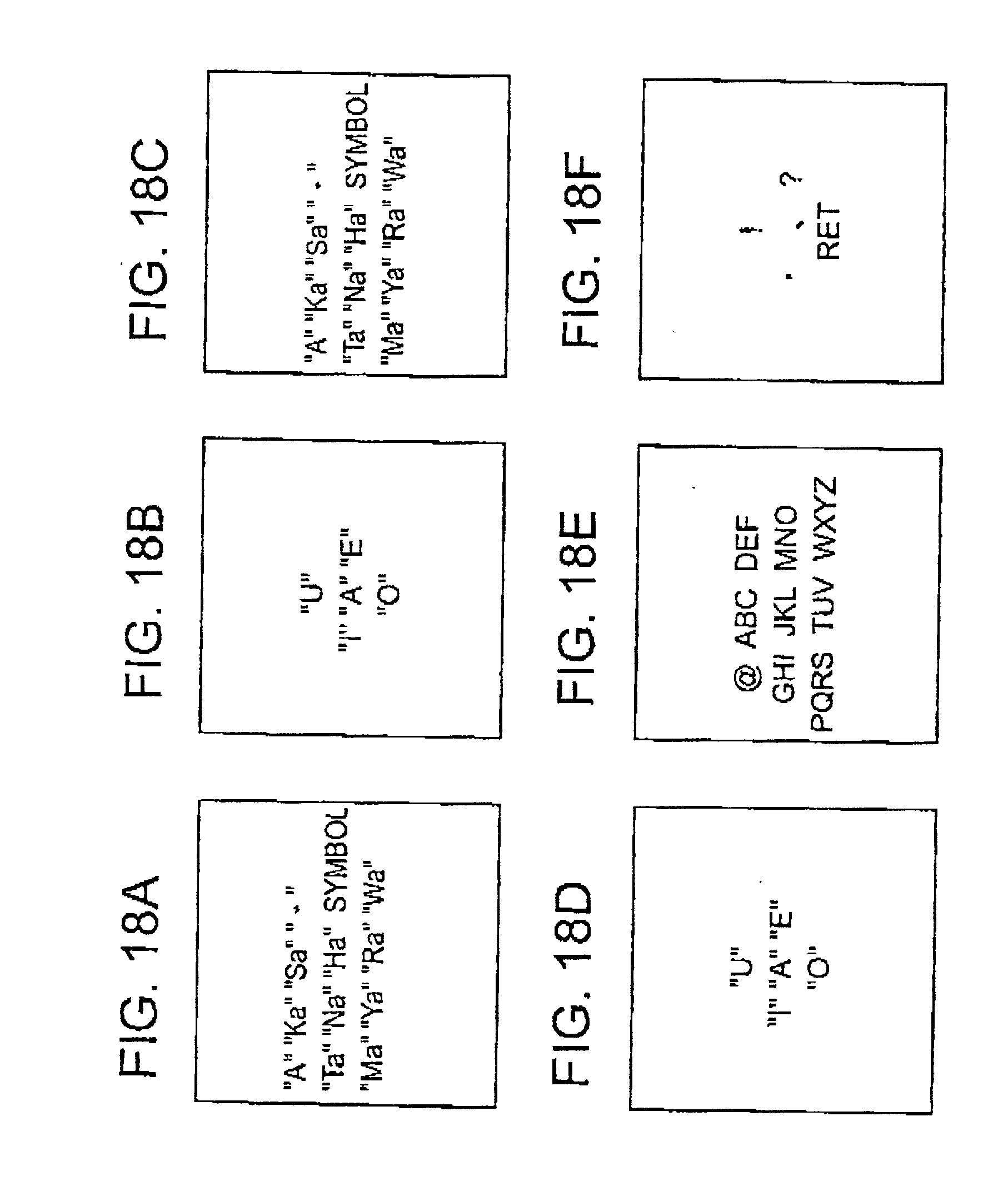 [0091]FIG. 17 is a block view functionally showing the configuration of the information processing device of the embodiment 2. In FIG. 17, the information processing device of this embodiment has a structure including an input unit 1700, a timepiece 1701, a telephone 1702, a character string generator 1703 and a display unit 1704. The character string generator 1703 has a structure including a character key set storage unit 1703a, a character key set selector 1703b, a character string converter 1703c, and a character, string storage unit 1703d. The input unit 1700 is for inputting various characters such as kana, alphanumeric characters and symbols and inputting various instructions such as character string conversion or switching over of the input character string type using a circular four-way controller 1605 located at the bottom of the display 1604. The four-way controller 1605 combines the functions of the up, down, left and right arrow keys of a keyboard for, for example, a desktop computer, and a confirm key i.e. the cursor moves up and down the display 1604 when the upper end or lower end of the four-way controller 1605 is pressed, moves horizontally when the left end or right end of the four-way controller 1605 is pressed, and the character key at the cursor position is designated at the processing target when the central portion of the four-way controller 1605 is pressed. The timepiece 1701 has functions for holding the current time, current date and a calendar, etc, to be designated for displaying at the display 1604, with respect to the display unit 1704 described later. The telephone 202 instructs a display unit 1704 described later to display numeric keys for inputting telephone numbers and has a function for transmitting and receiving information such as speech information and character information using radio waves, but in either case, this is not content central to the present invention and a detailed description is omitted. The character string generator 1703 includes a character key set storage unit 1703a, a character key set selector 1703b, a character string converter 1703c, and a character string storage unit 1703d. The character key storage unit 1703 stores predefined character key combinations and their arrangement in a ROM 1602. FIG. 18 is a view illustrating, both schematically and conceptually, an example of a character key set stored in the character key set storage unit 1703a. In the drawings, “a hiragana)”, “a (katakana)” and “ABC” etc. are respective character keys, with a plurality of character keys being arranged in a matrix comprising a plurality of rows and columns. The character key set selector 1703b selects character sets from the character key set storage unit 1703a in accordance with instructions from the operator. For example, a character key set of FIG. 18A is selected when an instruction designating the start of the making of a sentence by a user is inputted. The display unit 1704 described later is then instructed to display various character keys corresponding to kana, alphanumeric characters and numerals in accordance with the definition of the selected character set. A sentence can then be inputted using the desired characters by sequentially designating character keys displayed on the screen using the four-way controller 1605 of the input unit 1700. The character string converter 1703c converts character strings inputted in this manner into other character strings as instructed, by referring to a conversion dictionary not shown. A typical example would be a conversion from a hiragana character string to a kanji (Chinese character) character string. The character string storage unit 1703d stores a character string inputted from the input unit 1700 or a character string converted by the character string converter 203c in the above manner sequentially in the RAM 1603. The display unit 1704 displays the current time and type of character keys etc. on the display 1604 in accordance with instructions from each part. The input unit 1700, timepiece 1701, telephone 1702, character string generating unit 1703 and display unit 1704 then implement the function of each of the parts by having the CPU 1601 execute instruction processing in accordance with a program stored in the ROM 1602.