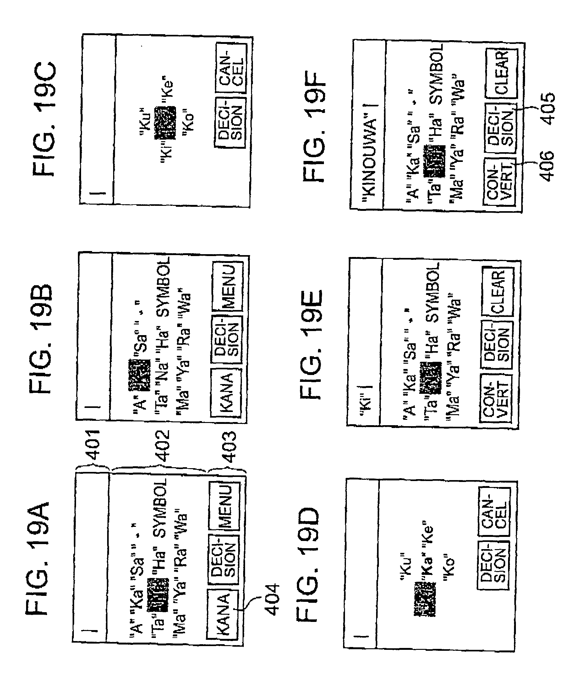 [0094]FIG. 19 is a view illustrating changes in content displayed in the display 1604 while inputting hiragana at an information processing device of the embodiment 2. First, a display screen for directly after commencement of processing for generating a character string at the information processing device of the embodiment is shown in FIG. 19A. In FIG. 19A, numeral 1901 is an input character display area for displaying undetermined character strings converted by the character string converter 1703c and confirmed character strings stored in the character string storage unit 1703d. Further, numeral 1902 represents a character key display area, and at this time, characters keys corresponding to the hiragana of “a”, “ka”, “sa”, “ta”, “na”, “ha”, “ma”, “ya”, “ra” and “wa” positioned at the uppermost row of the table for the 50 syllabary are displayed in a matrix shape composed of a plurality of rows and columns in accordance with a definition of FIG. 18A selected by the character key set select unit 1703b. The home position (initial position) of the cursor is in the vicinity of the center of the matrix and in this example, this is the position of the “na” key. The key at the cursor position is displayed in a reversed manner. Further, numeral 1903 is a function key display area and displays a function key for inputting various instructions to this device. Numeral 1904 is an input character type key, for displaying the type (in this example this is “kana”, i.e. hiragana) of character key displayed at the character key display area 1902 and, as is described later, the input character type can be changed by operating this key. In the situation in FIG. 19A, when the upper end of the four-way controller 1605 is pressed once, the cursor moves from the “na” key to the “ka” key, and the display screen becomes as shown in FIG. 19B. Further, when the central part of the four-way controller 1605 is pressed in this situation, the character key set selector 1703b selects a character key set composed of hiragana positioned at the same column as the hiragana “ka” of the fifty syllabary, i.e. “ka”, “ki”, “ku”, “ke” and “ko”, and requests the display unit 1704 to display these characters. FIG. 19C shows the display screen immediately after the display unit 1704 updates the character key display area 1902 in accordance with the definition of the newly selected character key set. The cursor is displayed at the home position, i.e. at the position of the “ka” key at the center of the matrix. When the left end of the four-way controller 1605 is pushed once in this state, the cursor moves from “ka” to “ki”, and the display screen becomes as shown in FIG. 19D. When the central part of the four-way controller 105 is pressed in this state, as shown in FIG. 19E, the katakana “ki” is displayed at the input character display area 1901 and the content of the display at the character key display area 402 is returned to the initial state of FIG. 19A. Each time an input for a character finishes, the content displayed at the character key display area 1902 is automatically returned to the first layout (shown in FIG. 19A and FIG. 19B) from the second layout (shown in FIG. 19C and FIG. 19D) and the cursor is also returned to the home position. An operator can therefore be aware of where in which layout the cursor currently is positioned and therefore does not become confused and can continue to input new characters. It may also be preferable to have the content displayed at the character key display area 402 remain at the second layout so as not to have to worry about automatically returning to the first layout when kana in the same column of the fifty syllabary table are to be inputted consecutively, such as with, for example, “ki ki” and “ki ka ku”. In the following, the cursor can be made to move to a desired character key or function key by pressing one of the upper, lower, right and left ends of the four-way controller 1605, and this key is then “designated” simply by pressing the center of the four-way controller 1605. FIG. 19F shows the display screen directly after inputting the hiragana “ki”, or similarly inputting the hiragana “no”, “u”, and “ha”. An underline is provided at the character string “Yesterday was ”, and it is shown that the character string is as yet in an indeterminate state. When the conversion key 1906 is pressed once in this state and no conversion candidate is selected, the character string is decided and underlining is removed. Further, a character string can also be decided by pressing a decide key 1905 for a few seconds or a confirm key for confirming a no change state can be provided in addition to the decide key.
