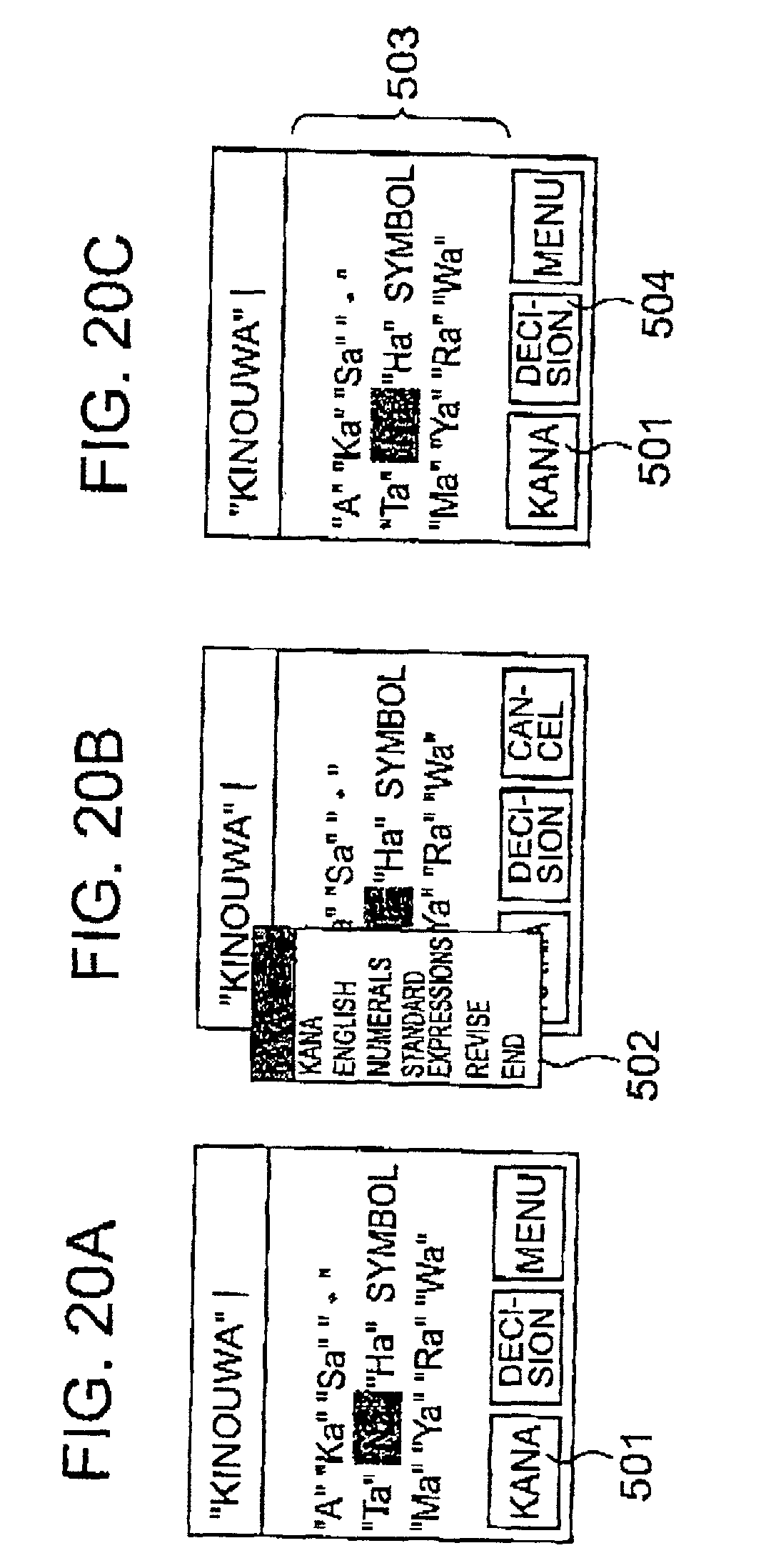 [0097] First, a display screen for directly after inputting/confirming the character string “Yesterday was” as described above is shown in FIG. 20A. When the input character type key 2001 is designated in this state, as shown in FIG. 20B, types of characters capable of being selected etc. are displayed at the input character type display area 2002, as shown in FIG. 20B. The currently selected character type (in this example, “kana”, i.e. katakana) is shown in reverse. FIG. 20C is a display screen for directly after “kana” (i.e. katakana) is selected from within these types of characters, with an indication that the input character type is katakana being displayed at the input character type key 2001 thereafter and the character key set for katakana shown in FIG. 18C being displayed at the character key display area 2003. In this state, the sequential character key is designated, and finally a katakana character string “Rachmaninoff” can be inputted and decided following on from the hiragana character string “Yesterday was” by designating the decide key 2004.
