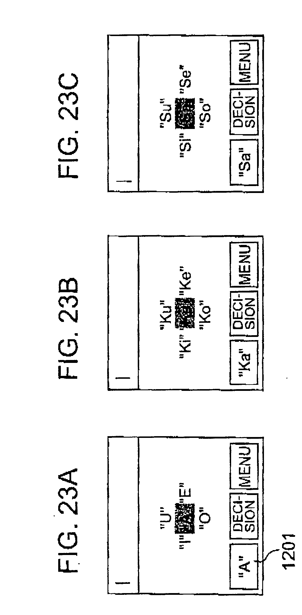 [0105] In the embodiment, for kana, in the case of a voiceless sound, a hierarchical designation method where a group is zoomed-in on and a certain character is designated after reaching a lower hierarchical layer is adopted, and in the case of palatalized sounds, a combination of a hierarchical input method where a plurality of pages are switched over between and the desired character is designated after reaching a lower hierarchical layer, and a parallel input method are adopted. However, kana can also be inputted in a completely parallel manner, as with symbols. FIG. 23 is a view illustrating changes in content displayed at the display 1604 while inputting kana in parallel at an information processing device of the present invention. The displayed character set can then be changed over in the order shown in FIG. 23A, FIG. 23B and FIG. 23C by designating the page changeover key 2301.
