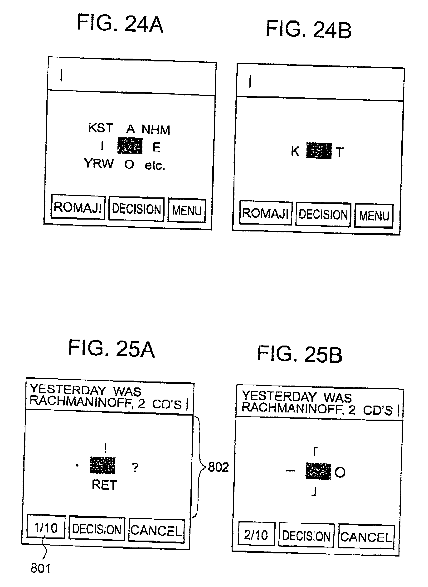 [0108] The vowels, which are used much more frequently compared to consonants, can then be inputted using fewer key operations as a result of being arranged at the cross-shape centered about the home position in the matrix for the first layout shown in FIG. 24A. Further, several of the vowels are displayed collectively in the first layout shown in FIG. 24A, one of which can then be designated in the second layout shown in FIG. 24B.