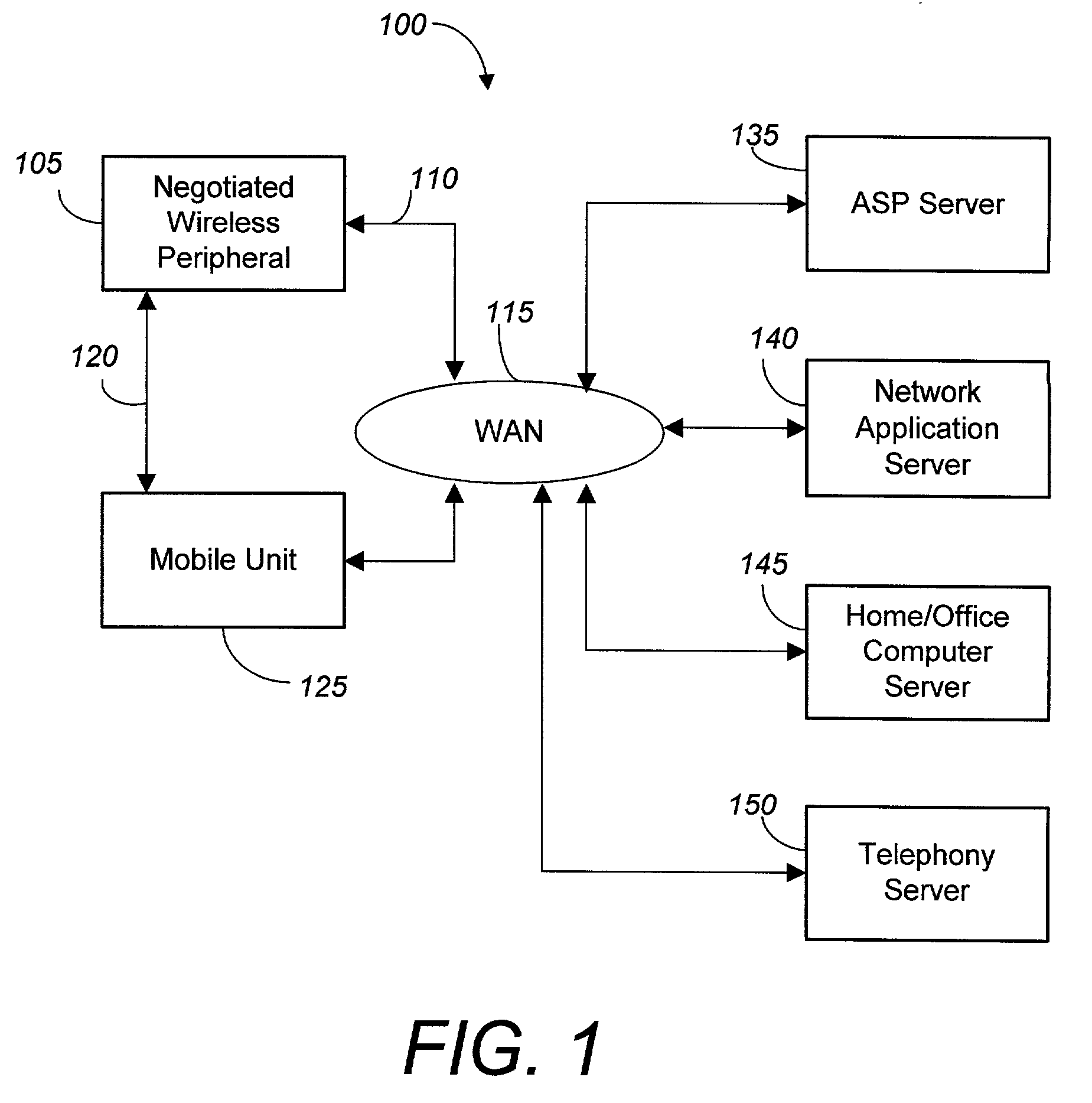 negotiating a position-dependent ecommerce session between the mobile unit and the negotiated wireless peripheral; negotiating the use of a set of peripheral services to be provided to the mobile unit by the negotiated wireless peripheral; establishing or reestablishing a communication session between the mobile unit and the application service provider server, whereby content in the session is customized to operate with a peripheral set augmented by the negotiated wireless peripheral; transmitting a set of data from the application service provider that causes the appearance of a desktop user interface to be displayed on a non-area constrained peripheral set augmented by the negotiated wireless peripheral. 38. The method of 39. The method of 40. A business method, comprising: