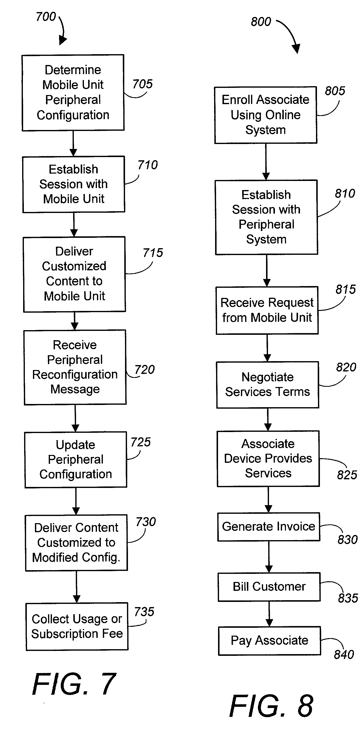 communicating with a mobile unit to initiate the establishment of a position-dependent ecommerce session therewith; engaging in a handshaking sequence with the mobile unit to establish the position-dependent ecommerce session; negotiating a billing arrangement with the mobile unit; supplying at least one peripheral augmentation service to the mobile unit; and billing for the peripheral augmentation service supplied to the mobile unit. 8. The method of 9. The method of 10. The method of 11. The method of 12. The method of 13. The method of 14. The method of passing a stub object to the mobile unit; and invoking an input and/or output method in a remote object that receives a message involving a marshaled method invocations and/or marshaled parameters from the stub object. 15. The method of passing a stub object to the mobile unit; and invoking a WAN communication method in a remote object that receives a message involving a marshaled method invocations and/or marshaled parameters from the stub object. 16. A mobile unit comprising: