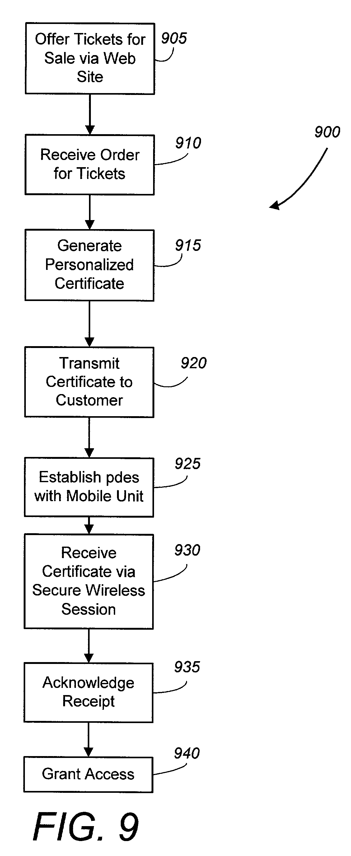 (i) engaging in a handshaking sequence with a mobile unit to establish a position-dependent ecommerce session; (ii) receiving via the position-dependent ecommerce session the encryption-protected ticket; (iii) generating an acknowledgement signal indicating the encryption-protected ticket is valid; and (iv) granting admission to the event upon validation of the encryption-protected ticket. 35. The method of 36. The method of 37. In a system comprising a negotiated wireless peripheral, an application service provider server, and a mobile unit that includes a short range wireless air interface, a wireless wide area network air interface, and an area-constrained user interface, a method comprising: