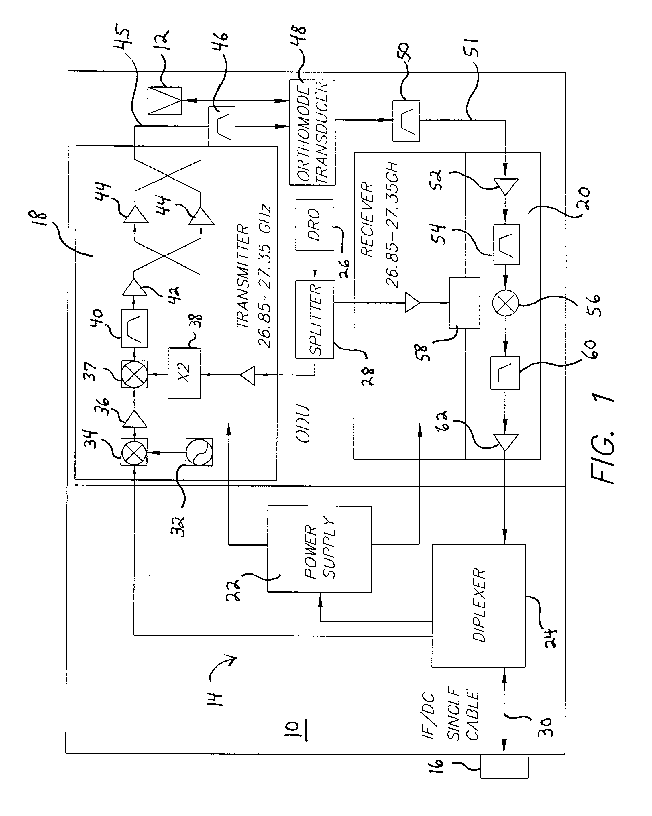 [0001] This application claims the benefit of U.S. Provisional Patent Application Serial Nos. 60/179,405, filed Feb. 1, 2000; 60/179,406, filed Feb. 1, 2000; 60/179,407, filed Feb. 1, 2000; 60/179,408, filed Feb. 1, 2000; 60/179,409, filed Feb. 1, 2000; 60/179,410, filed Feb. 1, 2000; and 60/179,731, filed Feb. 2, 2000. [0002] 1. Field of the Invention [0003] The present invention relates to microwave radio transmitters and receivers, and particularly to a transceiver which constitutes a complete outdoor radio unit for the Local Multipoint Distribution Service (LMDS). [0004] 2. Description of the Related Art [0005] The Local Multipoint Distribution Service (LMDS) is a wireless, broadband technology which is expected to provide a variety of communications services, including video distribution, high speed Internet access, real-time multimedia file transfer, video conferencing, and telecommunications, both for residential and commercial applications. LMDS systems use very high frequencies, the actual spectrum allocation varying from country to country. In the United States, the FCC auctioned licenses for the LMDS in 1998 for two blocks of frequencies located in the 28 GHz band and the 31 GHz band of the spectrum. The short wavelength at such frequencies means that communications in the LMDS is line of sight. Prototype systems use hubs or base stations mounted on towers spaced apart every few kilometers (4-5 kilometers, or about 2.5-3.1 miles apart) to repeat signals and to serve as the centers of cells which service several thousand subscribers, including residences and businesses by transmission to small rooftop antennas. LMDS may be integrated with conventional data transmission techniques, such as twisted pair or fiber optic cables, in a hybrid system. The transmission to subscribers could be by fiber optic cable, but a more likely scenario may be transmission by fiber optic cable to the base unit and retransmission to subscriber units by radio wave, as the advantage offered by LMDS lies partly in the elimination of hardwiring each subscriber unit, and partly in the increased speed of transmission and larger bandwidths by radio wave as opposed to transmission by modem over telephone lines. [0006] Nevertheless, many LMDS systems remain at the prototype level due to technical problems with transceiver equipment and with systems integration. Several problems exist with conventional LMDS transmitter and receiver equipment. [0007] Conventional LMDS transmitter and receiver equipment uses a plurality of discrete modules or components, increasing system costs and entailing loss of efficiency. A conventional transmitter may have a plurality of modules built in separate packages which are connected together. For example, a high power amplifier module may be connected to an upconverter and then attached to a connectorized filter and finally to the antenna feed. This construction approach requires developing techniques for matching the separate modules, and increases costs by the separate packaging of the modules, as well as the loss of transmitter power from coupling the components, with consequent decrease in transmitter power efficiency. Therefore, there is a need for an LMDS transceiver which reduces the number of separate modules in an LMDS transmitter-receiver system. [0008] A further problem with microwave transceiver design is the multiplication of components and internal layout of the transceiver within the housing. Modern microwave transmitter and receiver designs typically use frequency synthesizers having phase lock loop circuitry under the direction of a microprocessor. Such a system is outlined in U.S. Pat. No. 5,844,939, issued Dec. 1, 1998 to Scherer et al. Further, a Product Data Book from Qualcomm Incorporated, CDMA Technologies, of San Diego, Calif. downed from the Internet at URL http://www.qualcomm.com/cdmatechnologies/vlsi/q3236.html on Sep. 15, 2000, describes the Qualcomm® CDMA Technologies Phase-Locked Frequency Synthesizer integrated circuit Q3236® at pages 126-168, and a method of hardwiring the frequency synthesizer to operate at a single frequency without the requirement of a microprocessor at pages 126, 131. Further, connections between circuit boards frequently require a plurality of cables, some being used for high frequency signals and others being used to transfer DC voltages between circuit boards. It would therefore be desirable to reduce the number of discrete components and improve the internal architecture of a transceiver for the LMDS by providing better matching sections. [0009] Another problem encountered in transceivers for LMDS operation is efficient heat transfer. Many transceivers rely upon air convection for the cooling of electronic components, and require a fan to force air flow through the housing. While effective, this design approach increases transceiver size and cost. Further, printed circuit boards in conventional microwave transceivers usually use silver, copper molybdenum, and copper tungsten as carrier material for attachment by conventional solder connections. Such carrier materials are not as efficient heat conductors as copper, and traditional solder connections are not flexible, causing attached components to break during expansion and contraction of the printed circuit boards. Consequently, it is desirable to have a transceiver for LMDS operation with improved heat transfer properties in order to house the transceiver in a smaller package. [0010] None of the above inventions and patents, taken either singularly or in combination, is seen to describe the instant invention as claimed. Thus a complete outdoor radio unit for lmds solving the aforementioned problems is desired. [0011] The complete outdoor radio unit for LMDS is a light weight, compact transceiver featuring planar circuitry. The transceiver uses cross polarization through an orthomodal transducer to provide isolation between the transmitter and receiver. The transceiver in